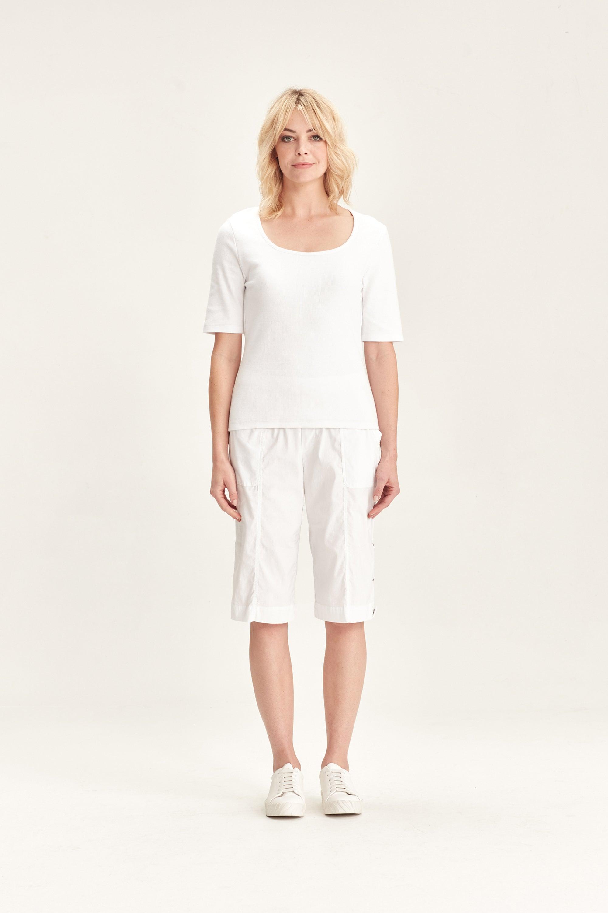 Straight leg shorts with side tabs to change the length. Features side pockets, panel detail through the leg, and elasticated waist.