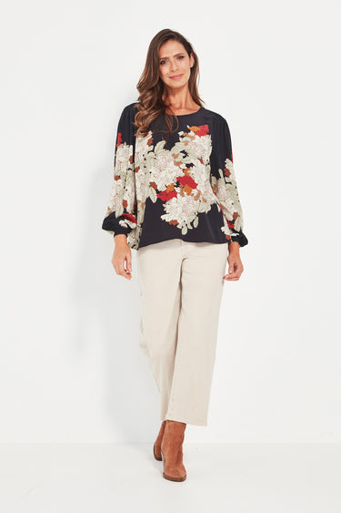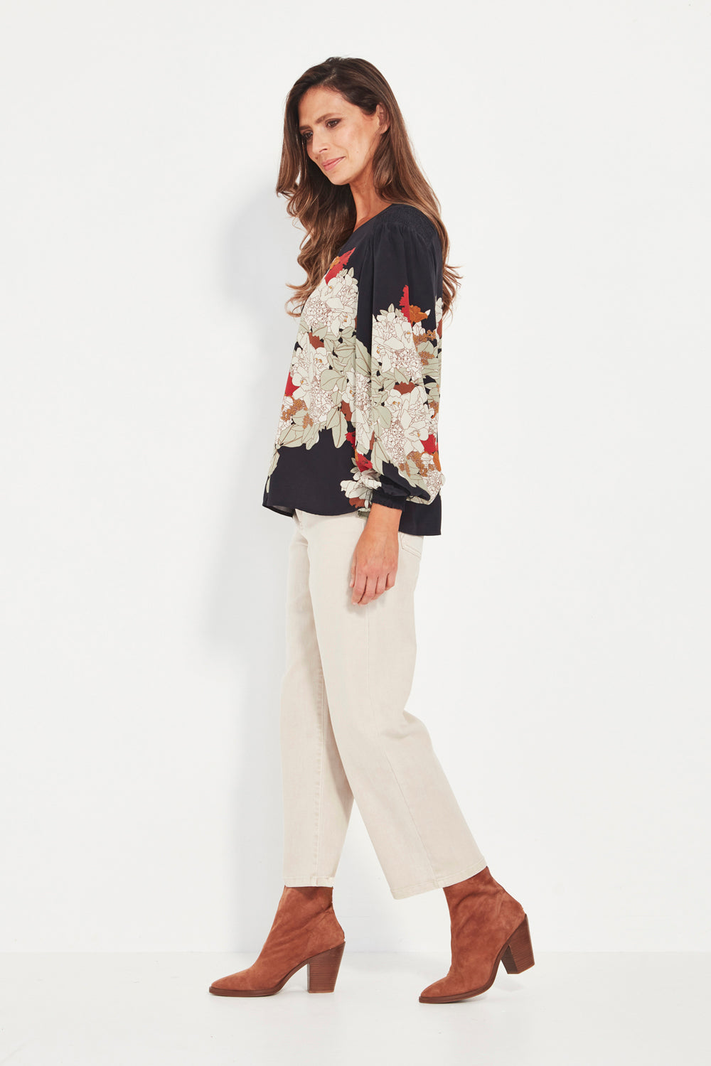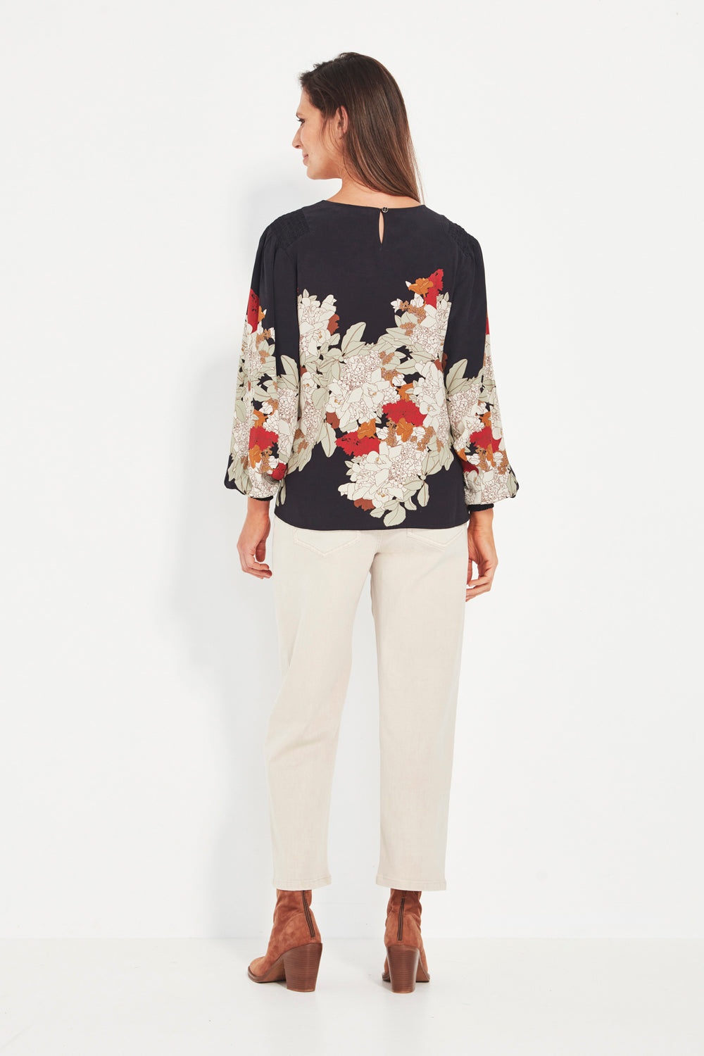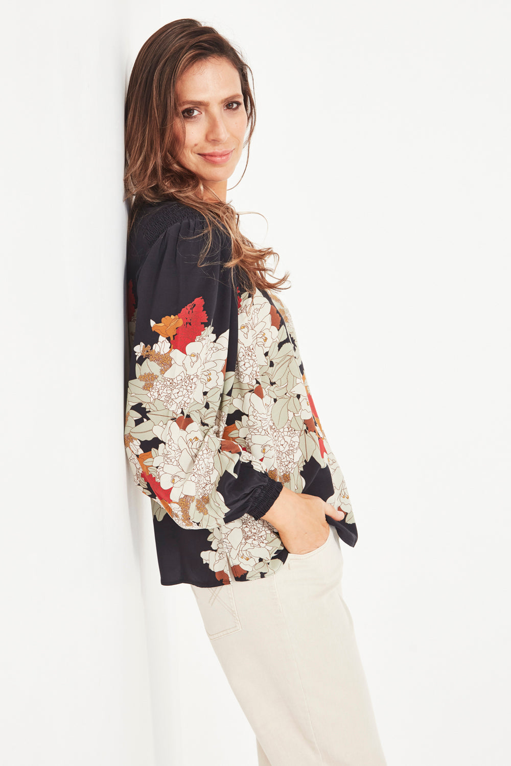 The Bouquet Top is crafted from a soft, flowing fabric that drapes beautifully on the body, creating an elegant and effortless silhouette. Delicate shirring at the shoulder and cuffs adds gentle volume and refined texture, giving the blouse a feminine, expressive finish.