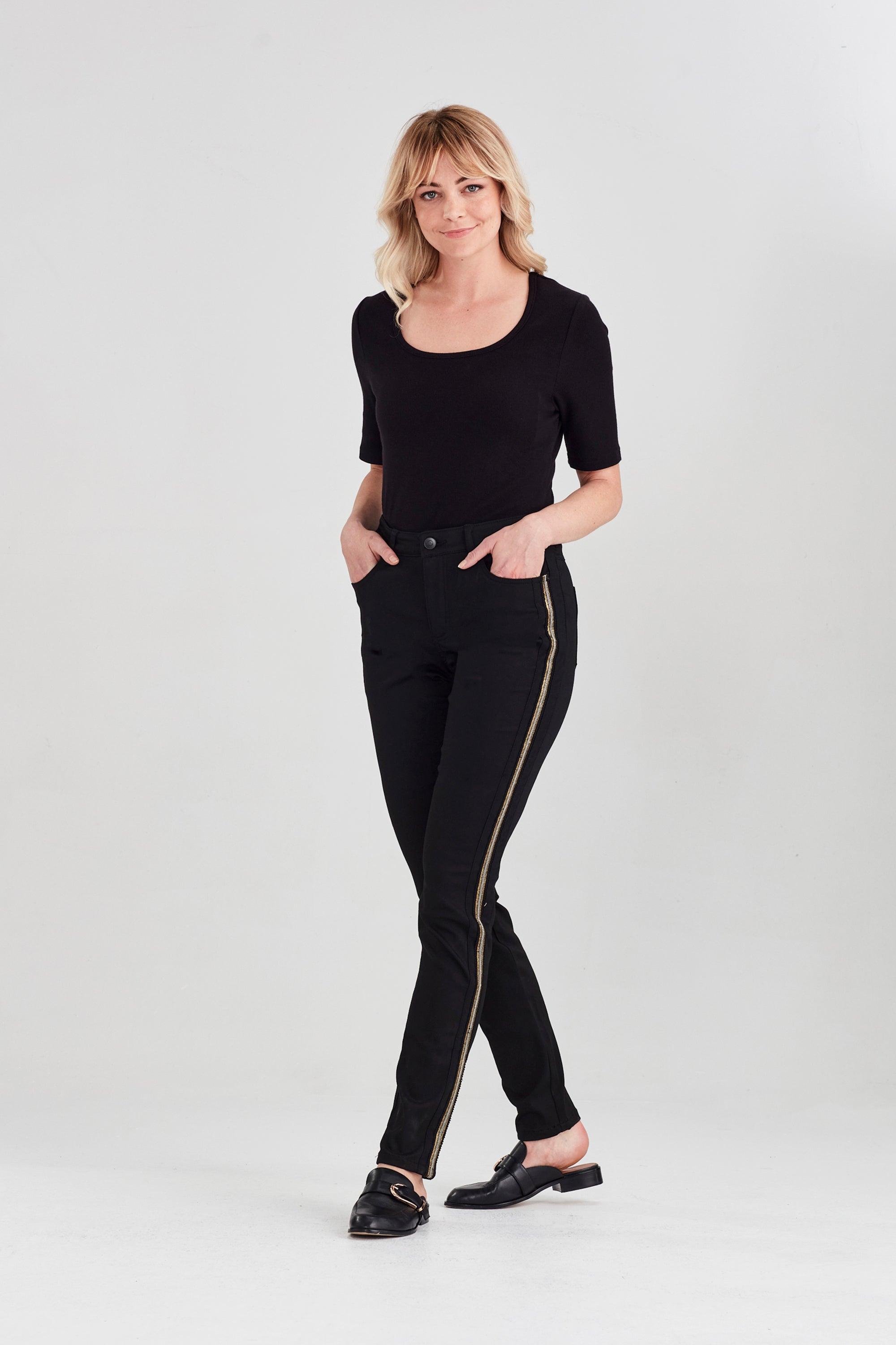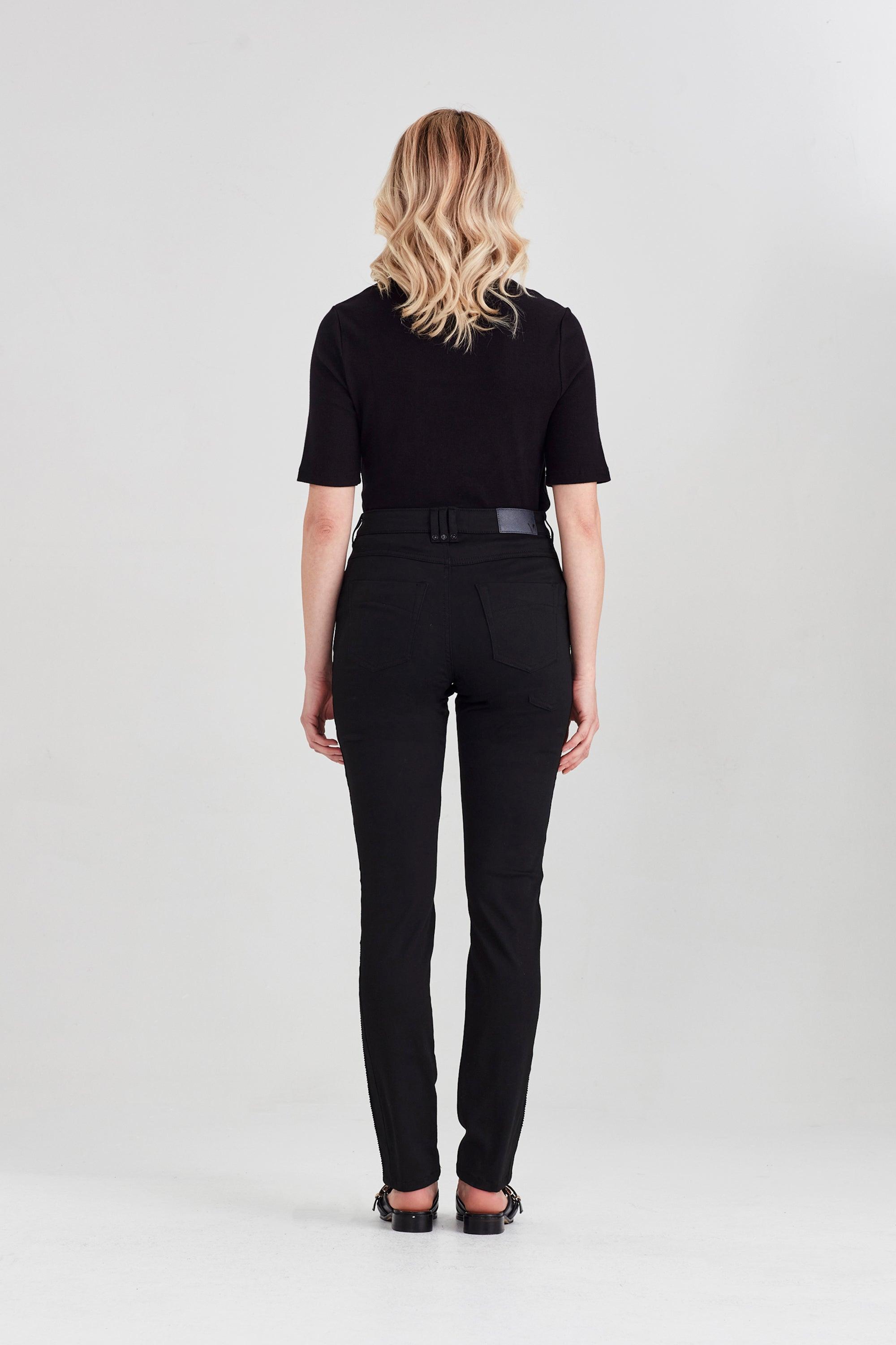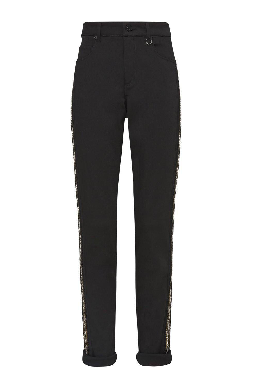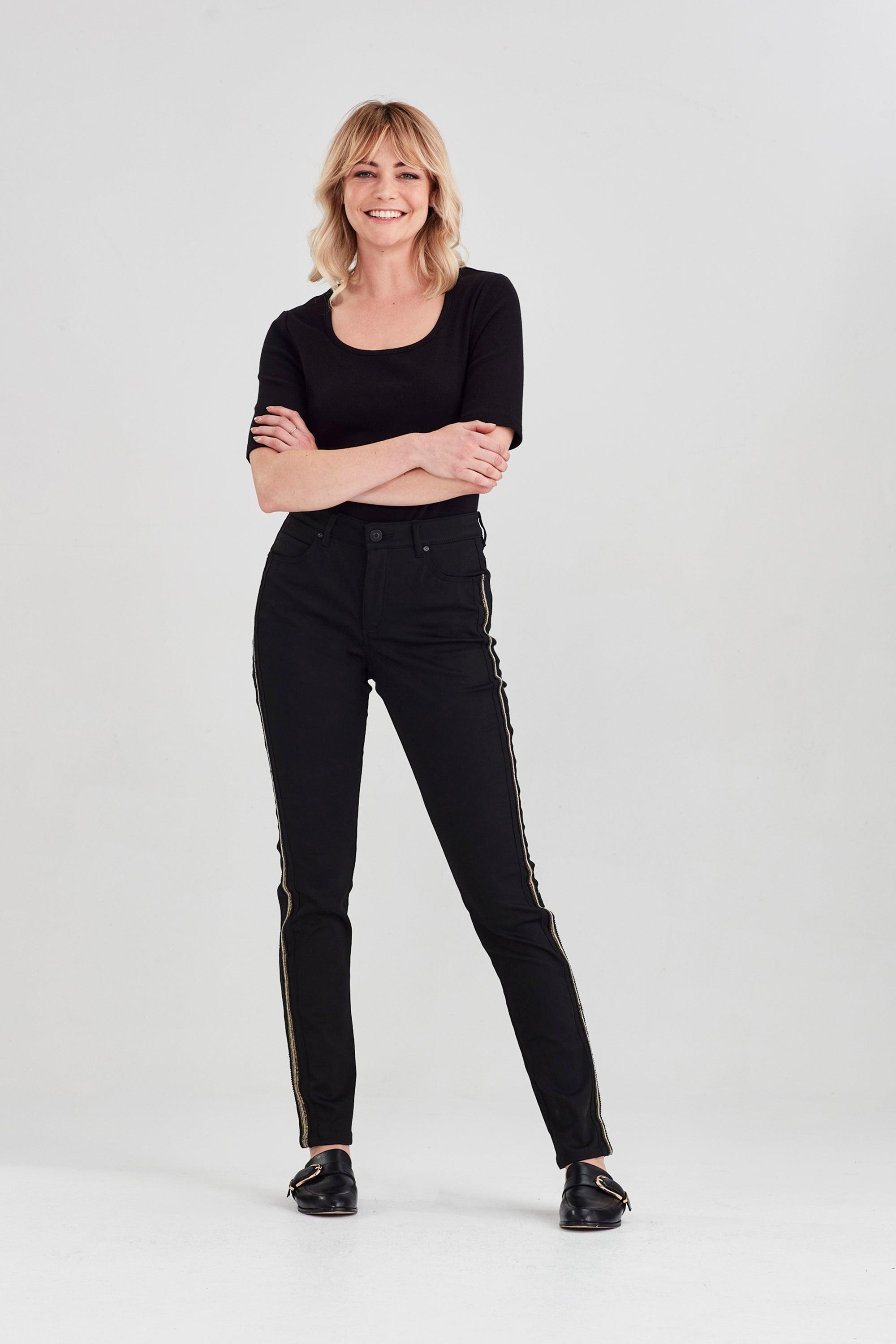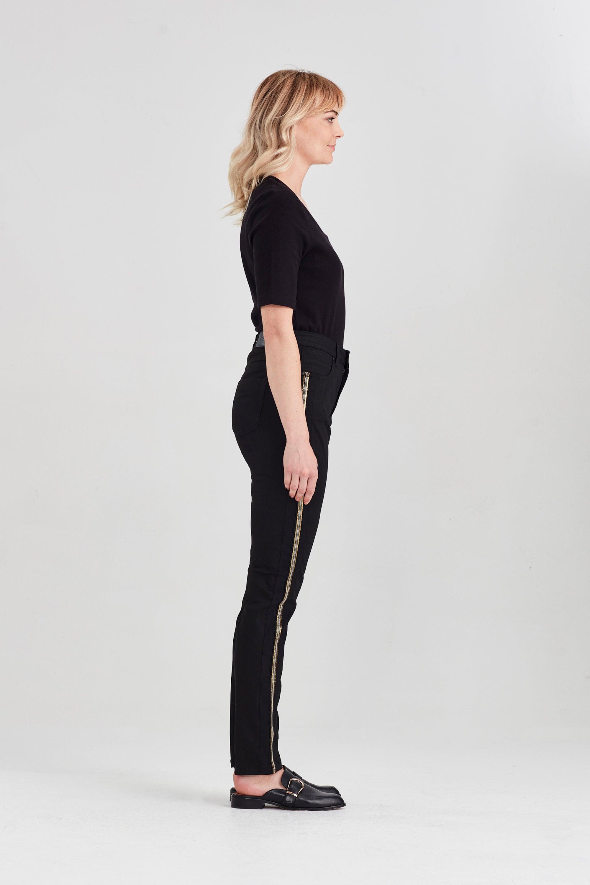 The Empire Jean features a beautiful statement chain and sequin tape detail on the side of the leg. Forever black stays black and doesn't wash out as easily as other black jeans.  Clean and easy with a 5-pocket design detail.