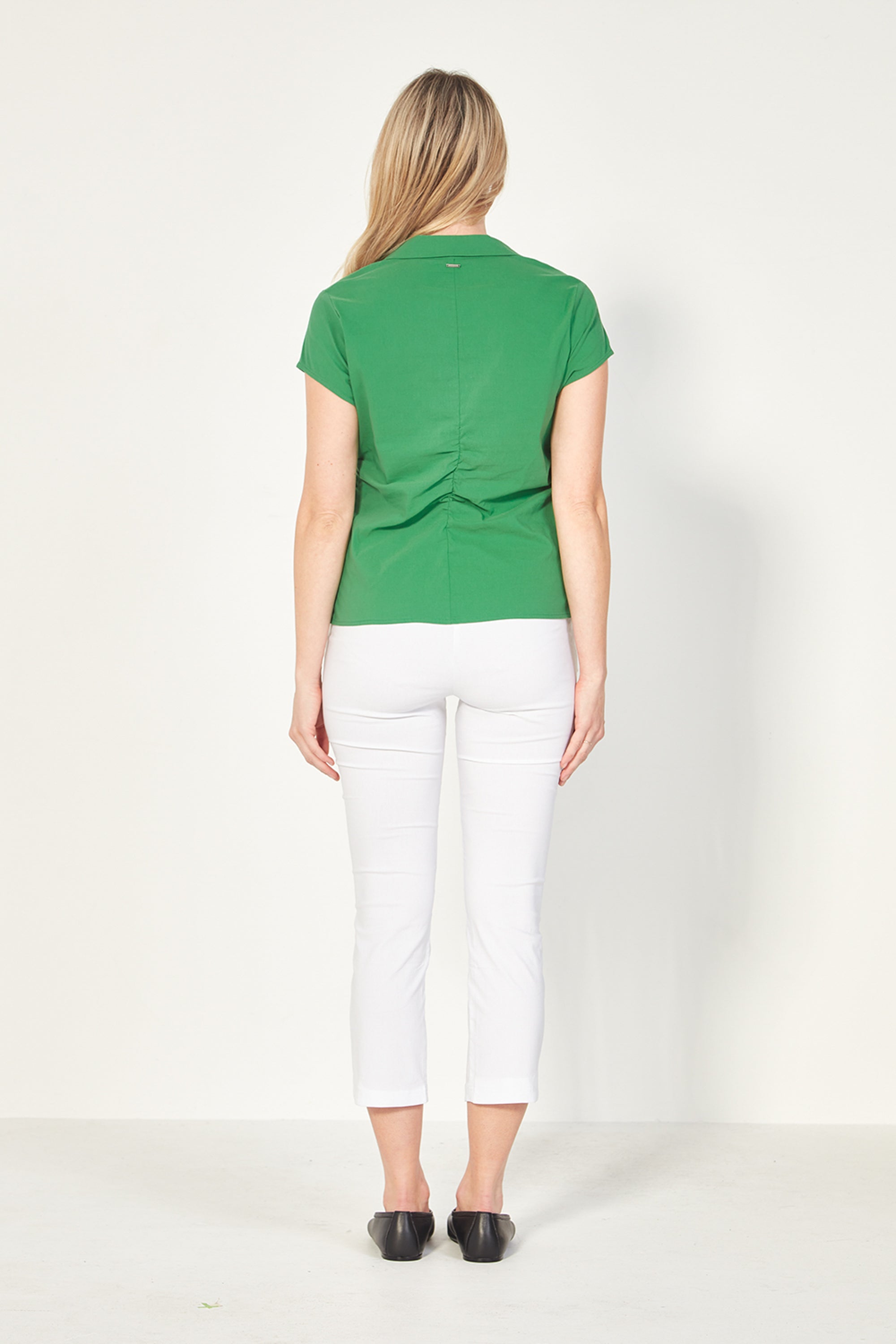 This Acrobat Theory Top flaunts a collared V neckline, accented by a ruched front detail. It features short sleeves and has a small frame design that falls to the top of the hip.