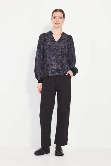The Riot Blouse is crafted from a soft drape fabric that falls beautifully and feels effortless to wear. The refined Mandarin V-neckline creates a clean, elongated line, while the full sleeves gathered from the shoulder add soft volume and a feminine silhouette.