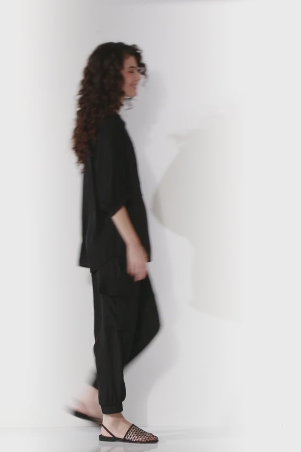 Glide by Verge- Soft tumbled satin shirt with Mandarin collar and button front placket. Elbow length sleeve with half elasticated cuff. The Rotate shirt falls just below the hip.