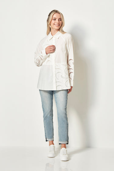 100% Cotton shirt with laser embroidered detail.  The Enlighted shirt is collared with a button-through front placket.  Embroidered detail fabric is attached to one-half side of the front and half side of the bottom of the shirt.  The sleeve features embroidered fabric from the elbow and button cuff.  The back yoke is angled with an insert of embroidered fabric.  The Enlighten shirt is oversized with a fit and flare shape and falls to the top of the thigh.