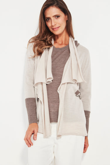 The Interact Cardi brings sculptural movement and modern contrast to winter layering. Designed with a striking two-tone waterfall collar, it creates a soft, fluid drape that frames the neckline beautifully. The wrap crossover front, secured with refined hardware, adds a contemporary edge and allows the cardigan to sit effortlessly on the body.