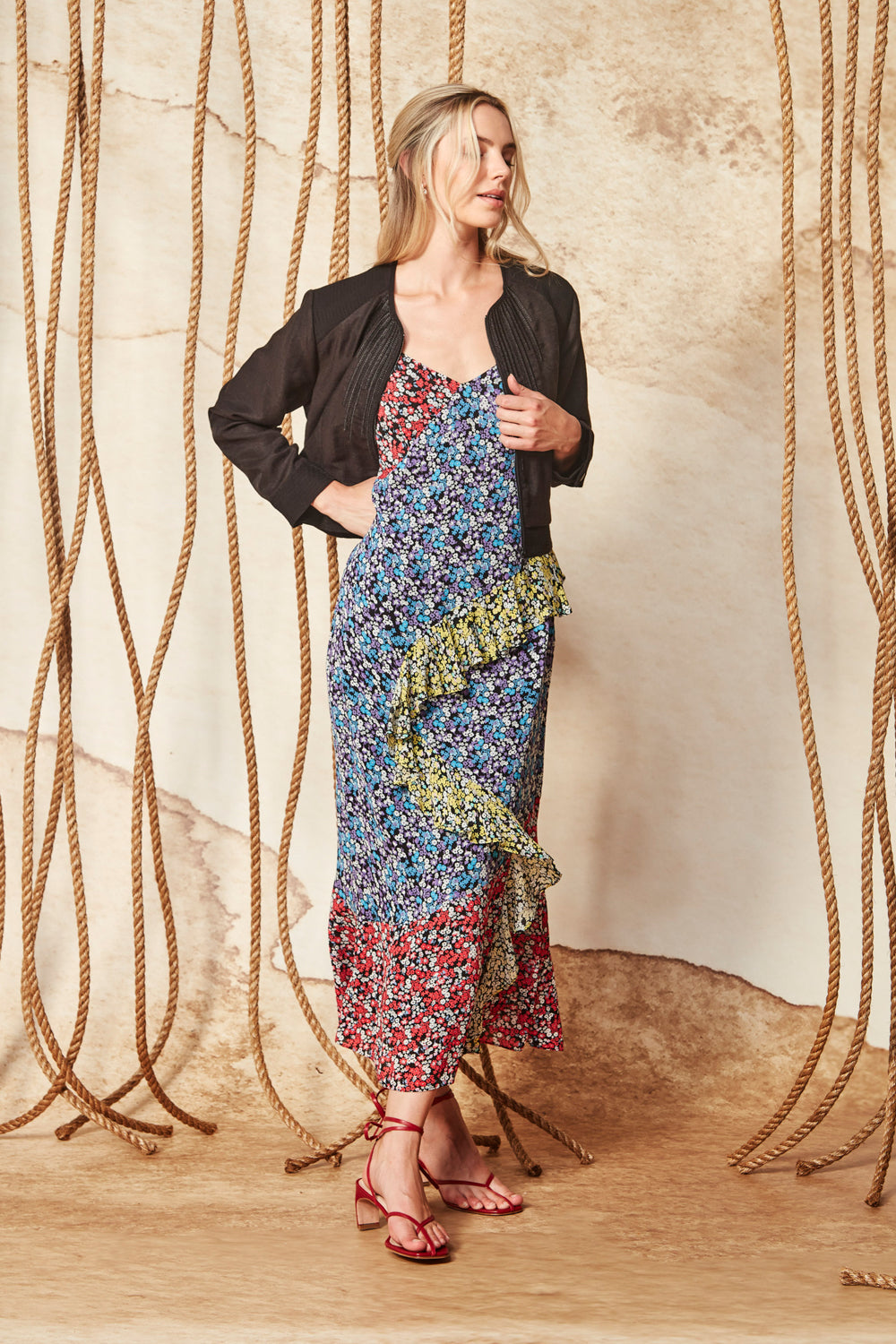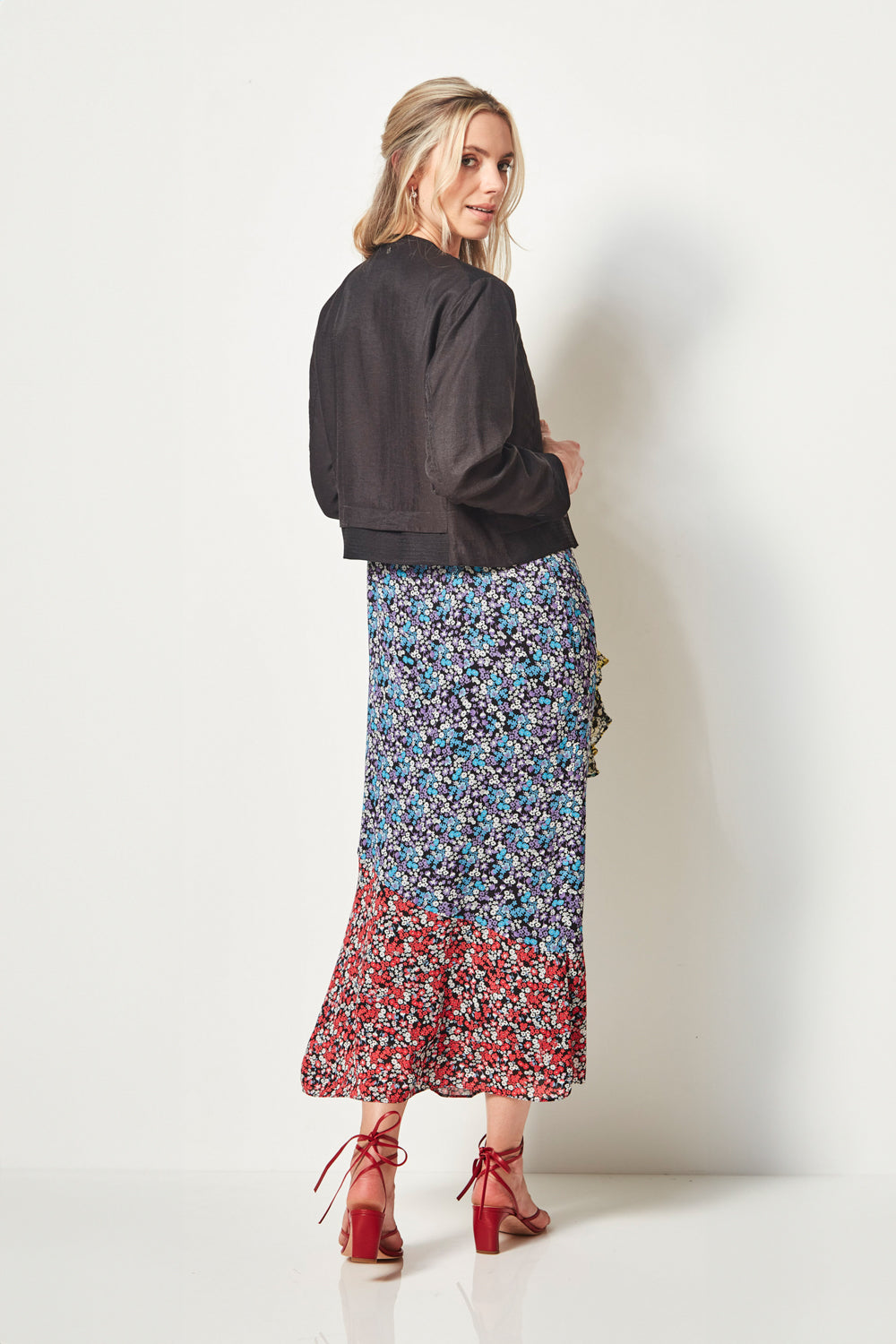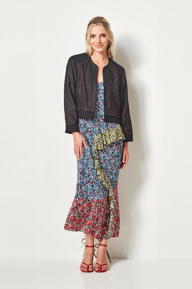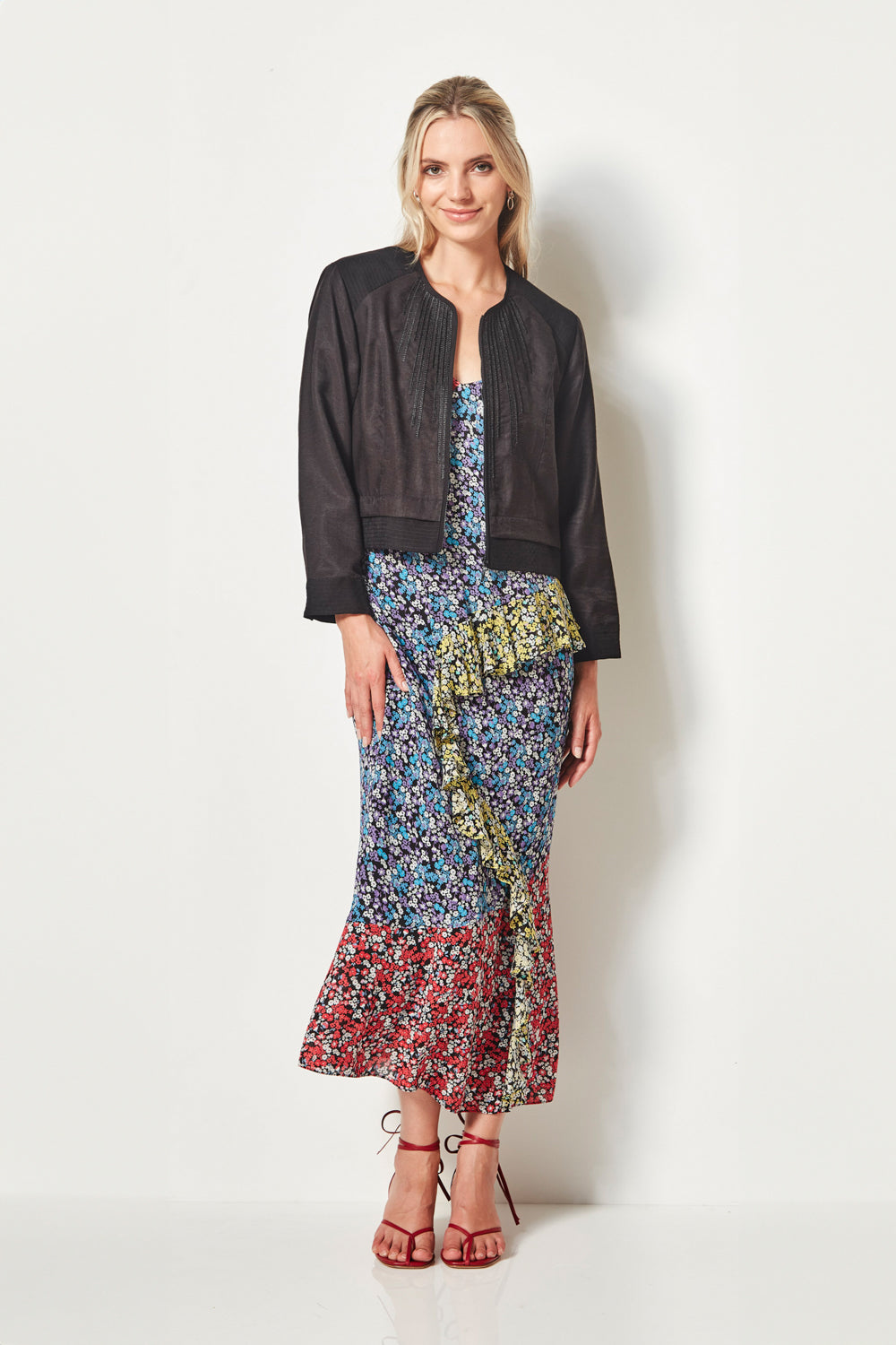 Full-lined cropped jacket with zip front.  The collarless Grade jacket features embroidered detail around the neckline.  The Grade jacket falls to the waist.