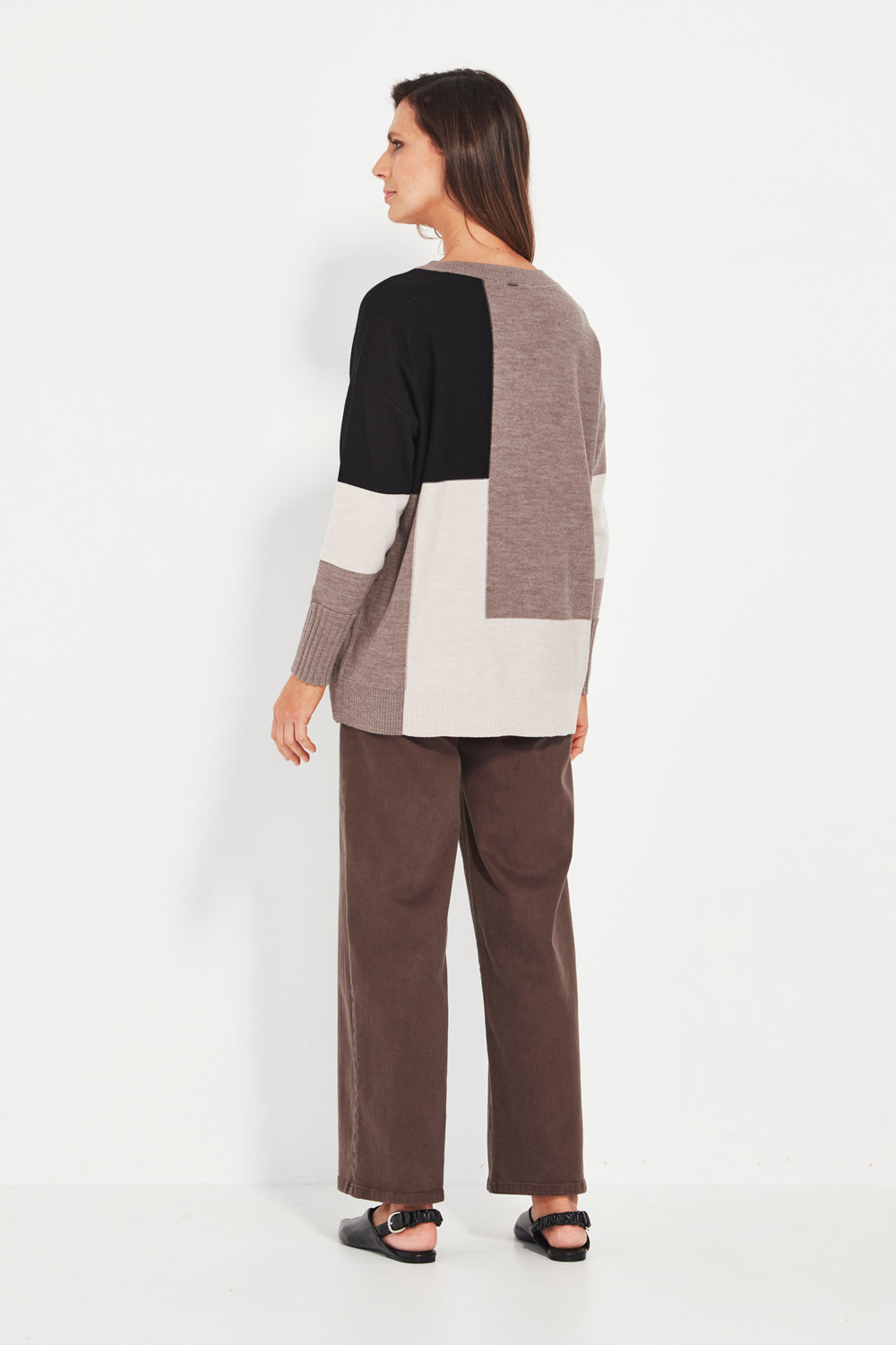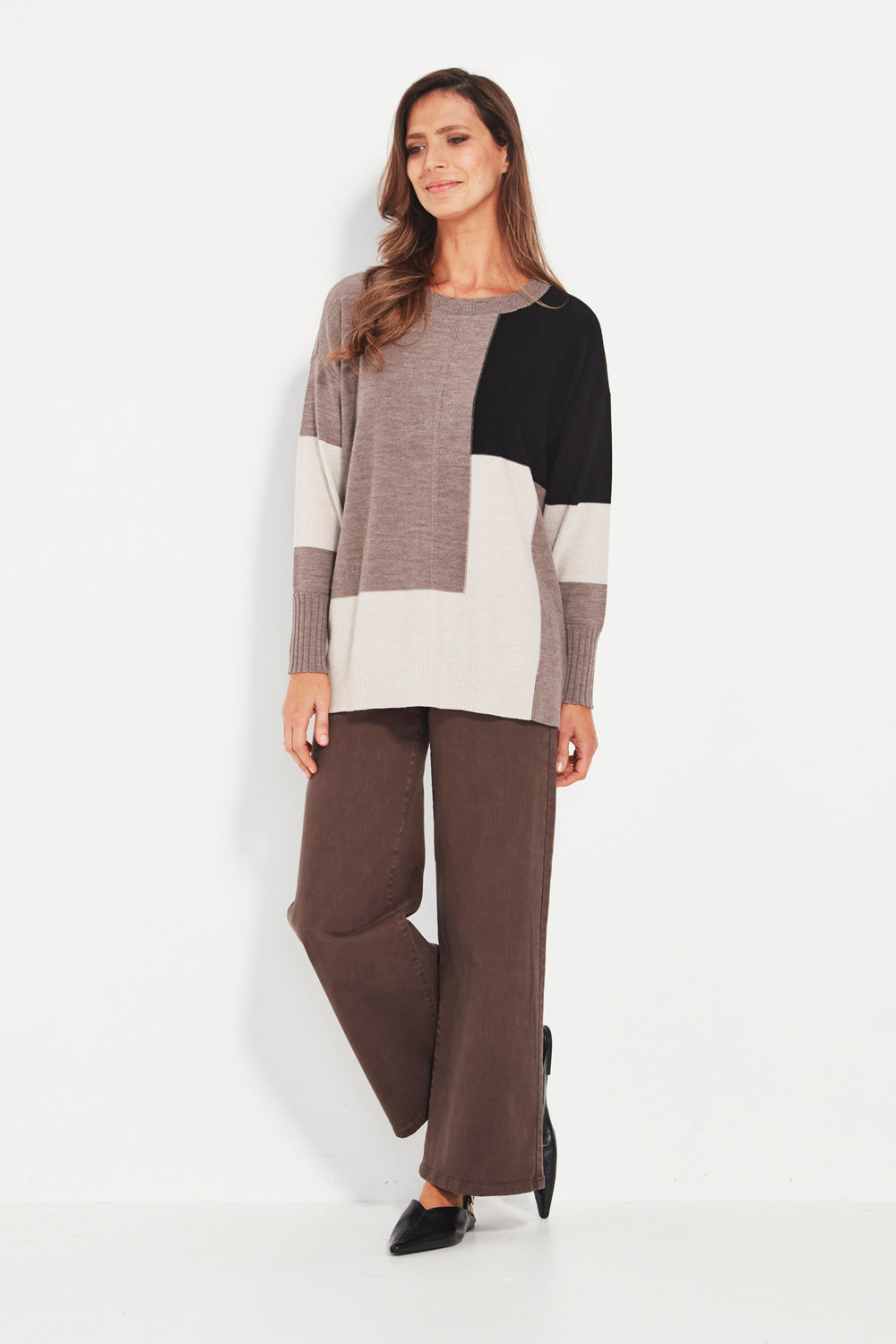 The three-colour design adds subtle contrast and interest without overwhelming the silhouette, making it a versatile knit you can dress up or down. Falling below the hip, it delivers a flattering, effortless finish that pairs beautifully with denim, soft pants, or tailored winter layers.