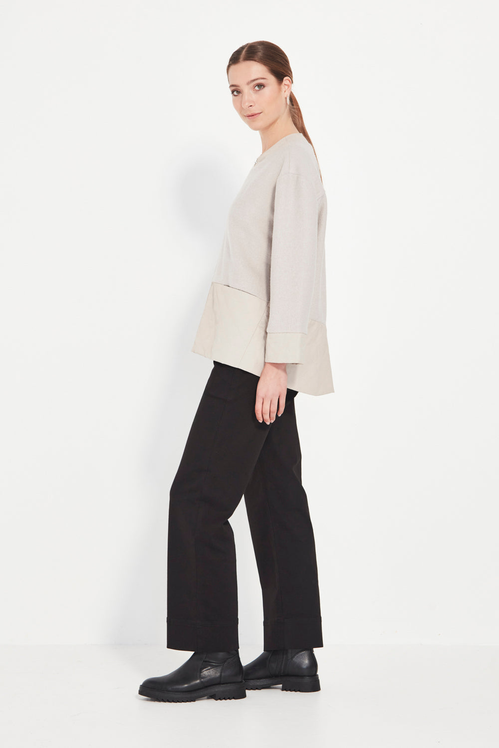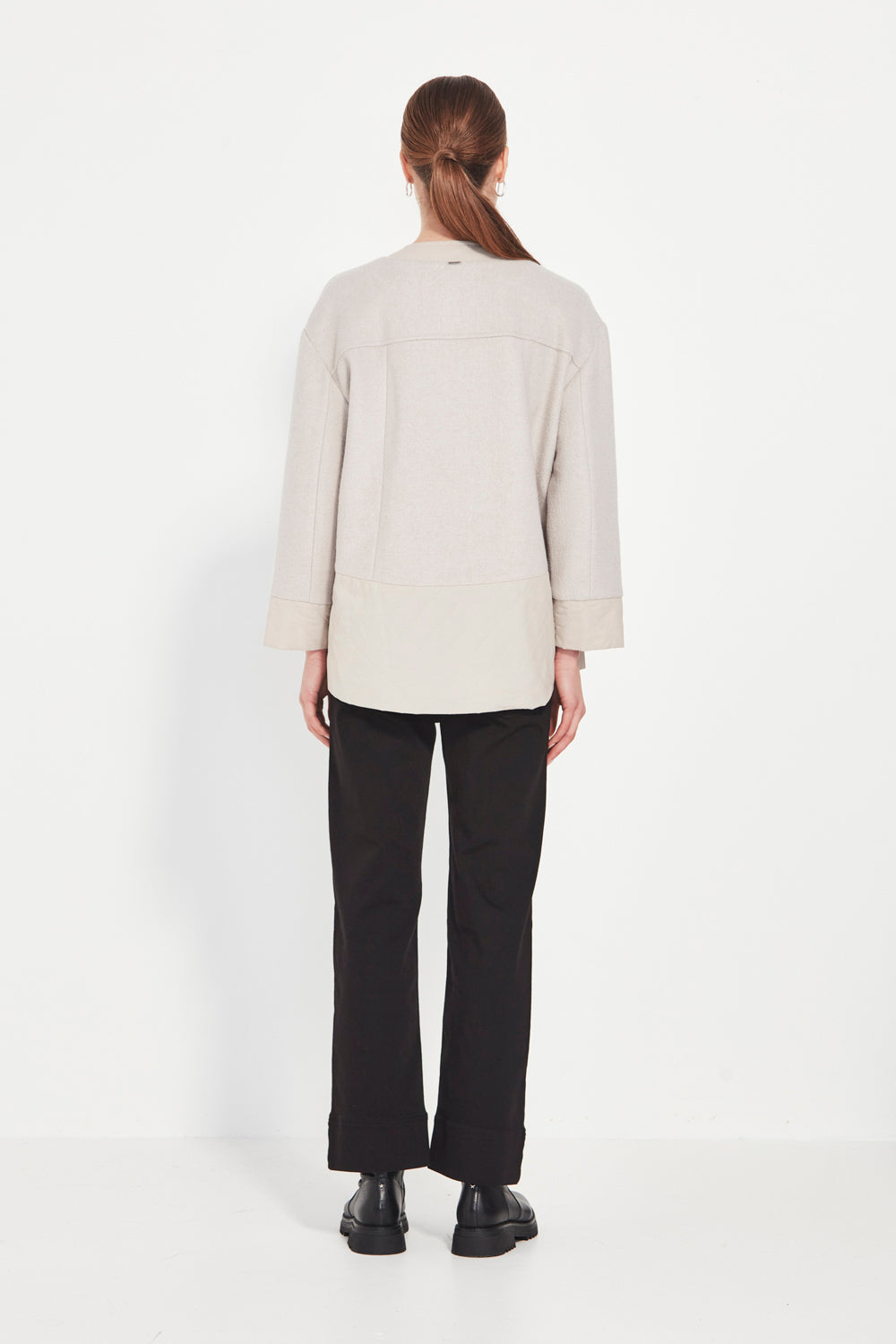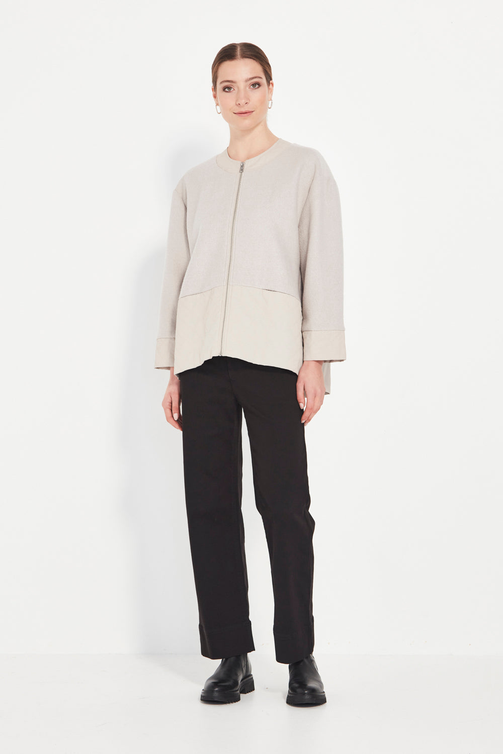 The Faye Jacket blends modern texture with everyday ease. Designed with a clean crew neckline and a sleek front zip, it offers a refined, streamlined silhouette. The neckline and patch pockets are crafted in a contrast quilted fabric, adding depth, softness, and a subtle utility-inspired edge.