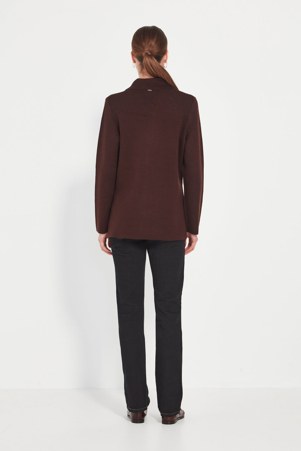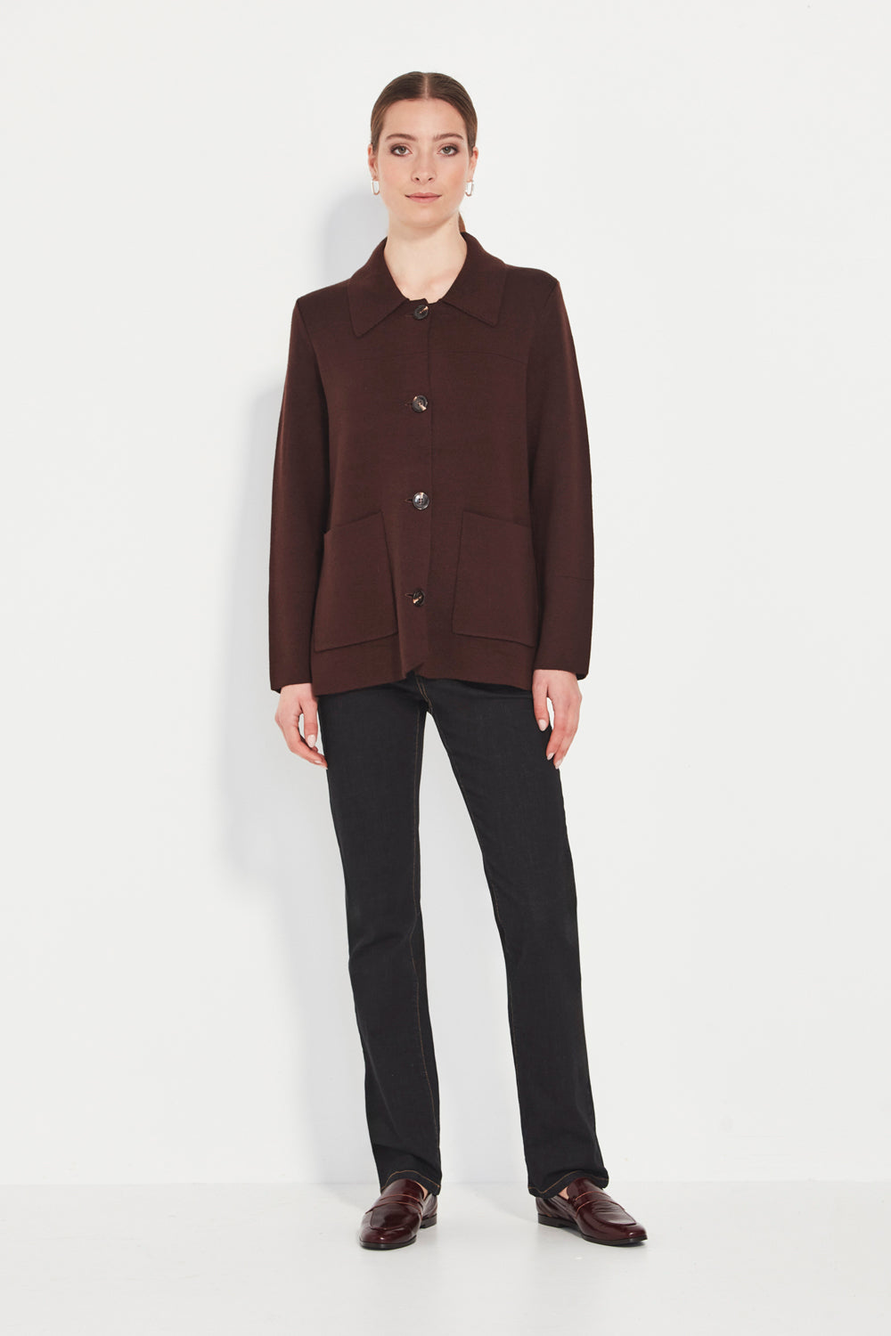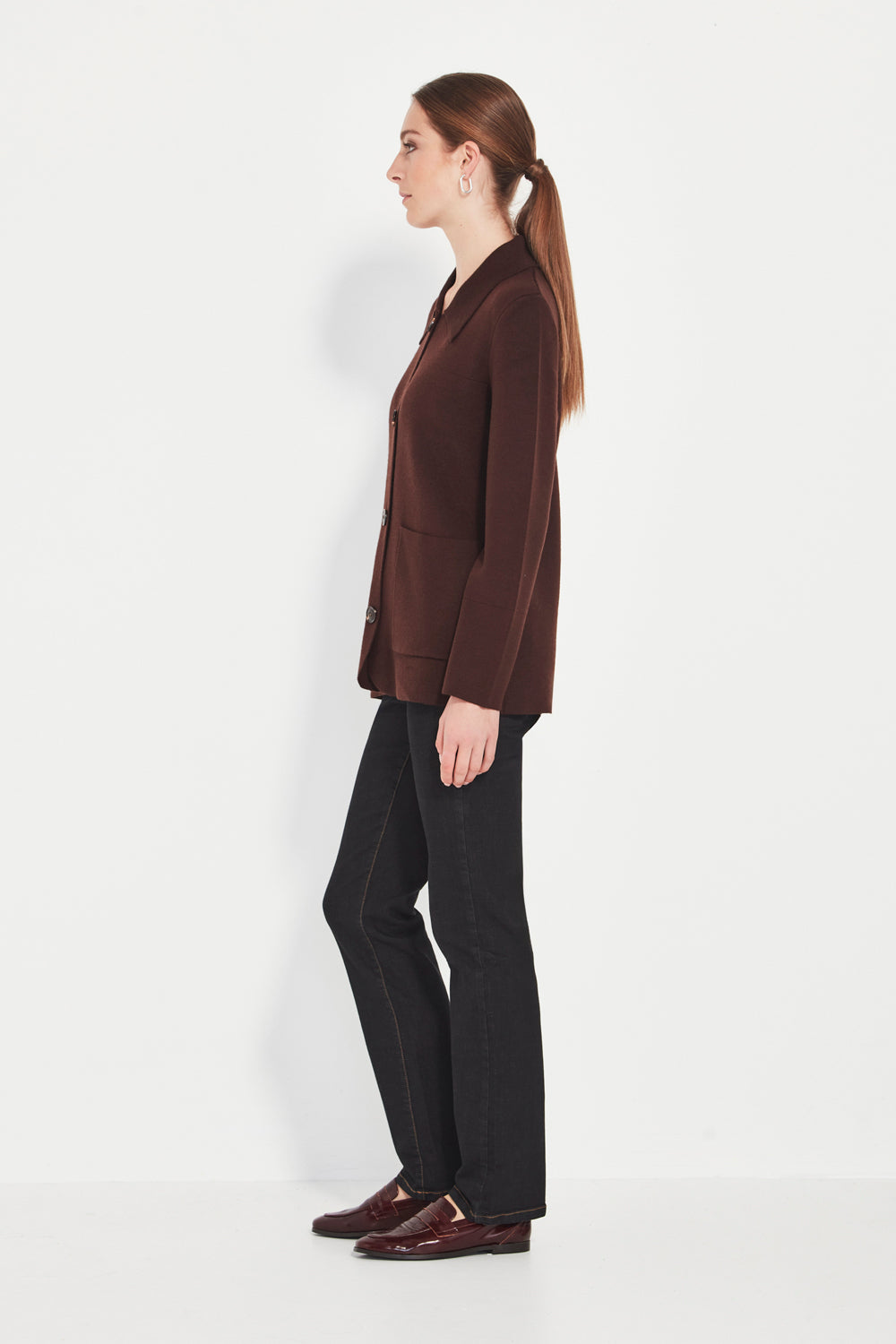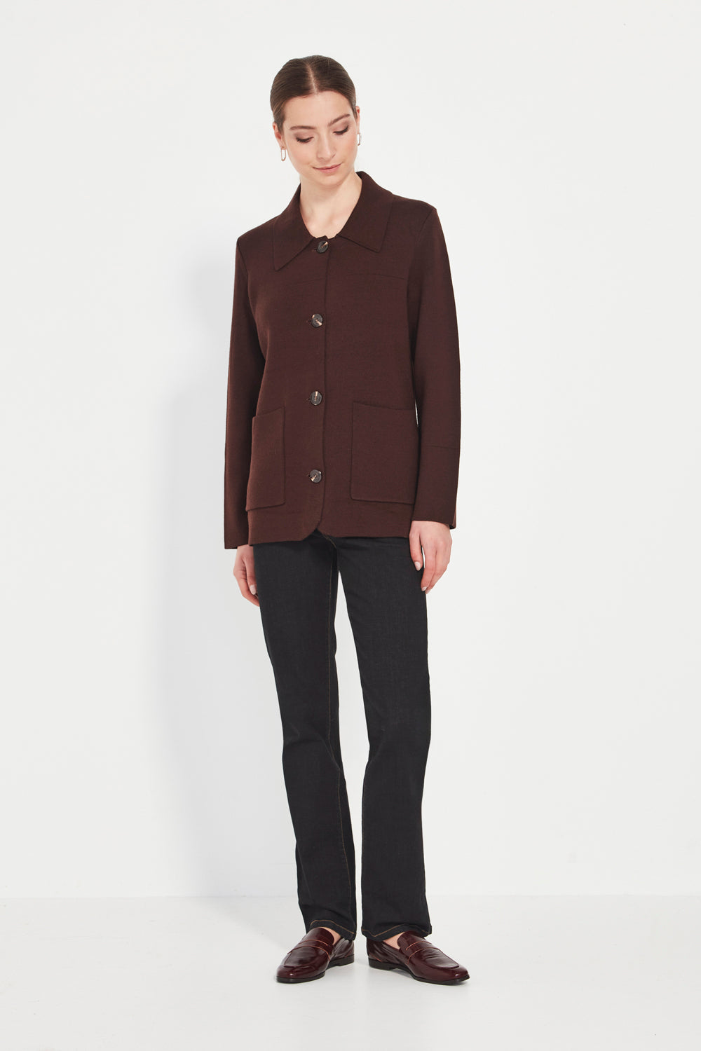 Patch pockets add practical function and a modern utilitarian touch, while the jacket’s length — falling below the hip — creates a flattering, elongated line. A versatile piece that shifts effortlessly between work, weekend, and relaxed everyday dressing.