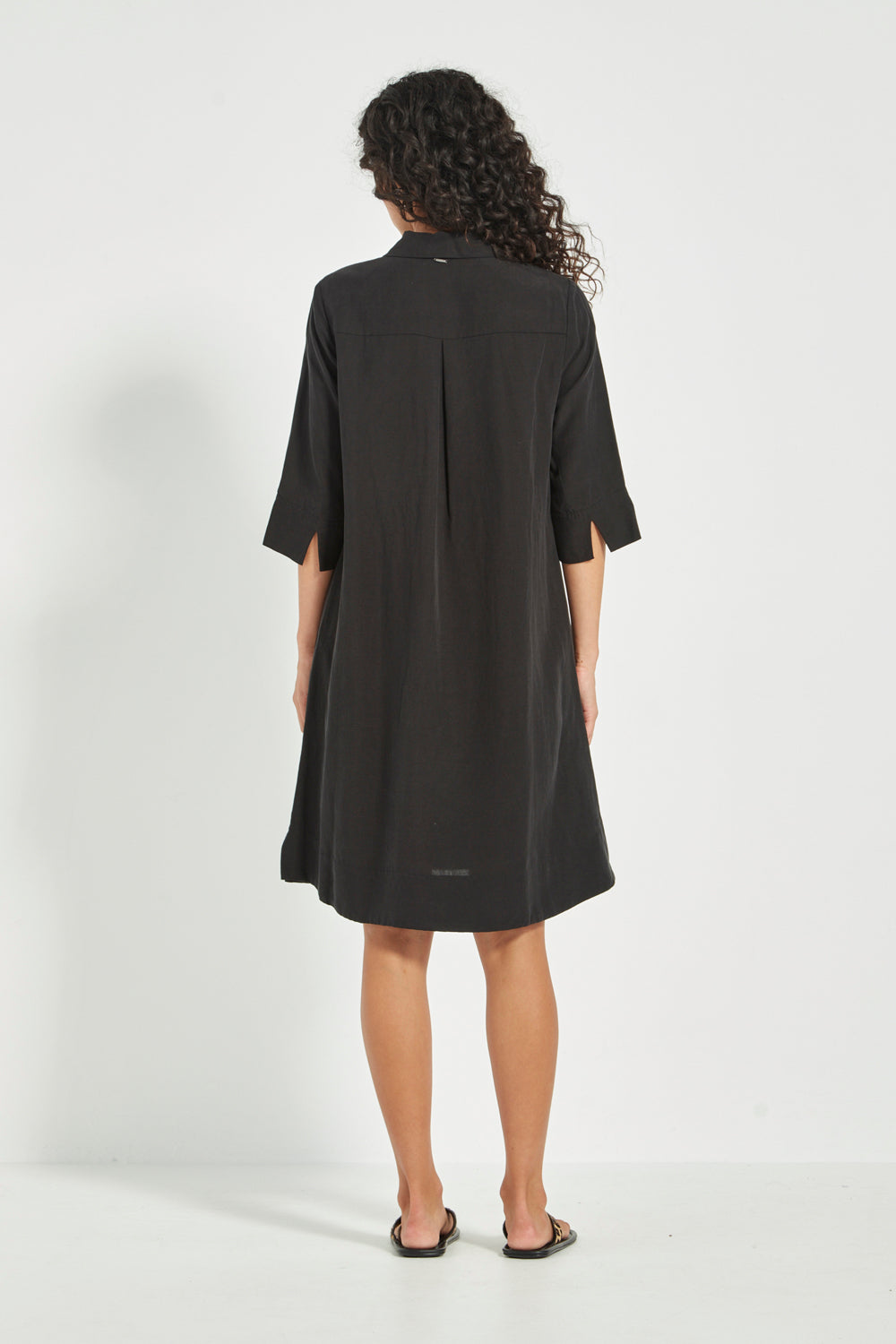 The Seville Dress is a relaxed yet refined shift silhouette crafted from lightweight Tencel linen. It features a stand collar, a half-placket front, and elbow-length straight sleeves finished with split cuffs. An inverted pleat at the back adds ease of movement, creating a timeless design that flatters all body shapes.