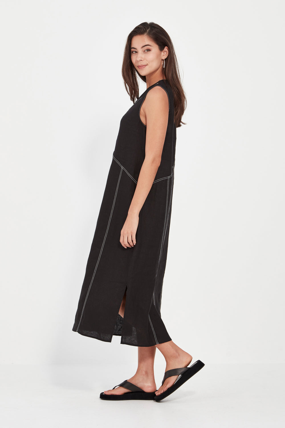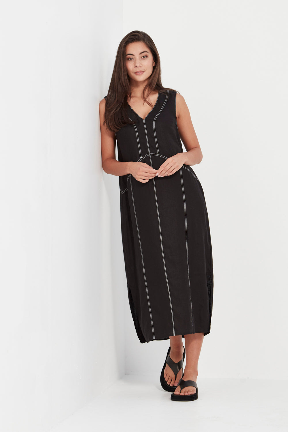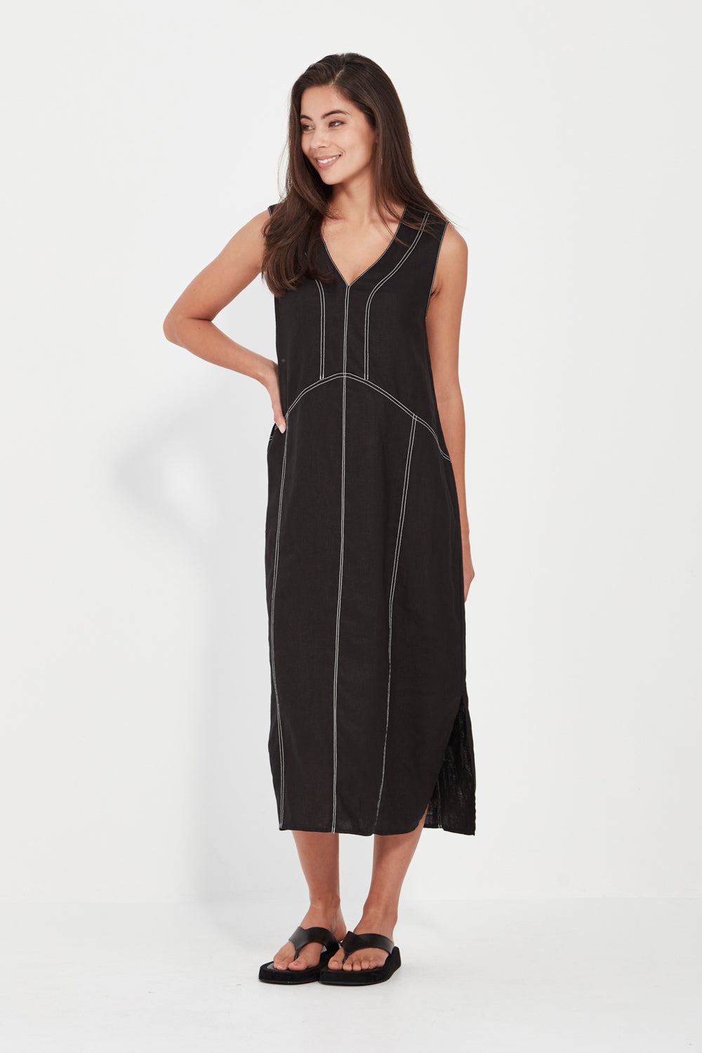 The Cordelia Dress is crafted from 100% linen in a sleeveless V-neck silhouette with contrast topstitching detail. Cut in a straight fit that flatters the body, it falls to mid-calf with side splits for ease and movement. Effortlessly versatile—wear it casually or dress it up for dinner.