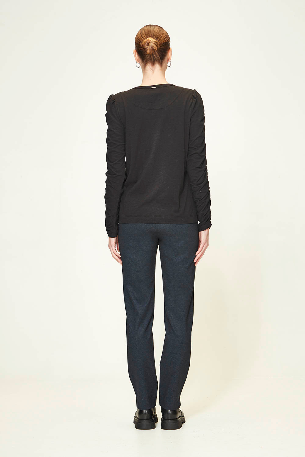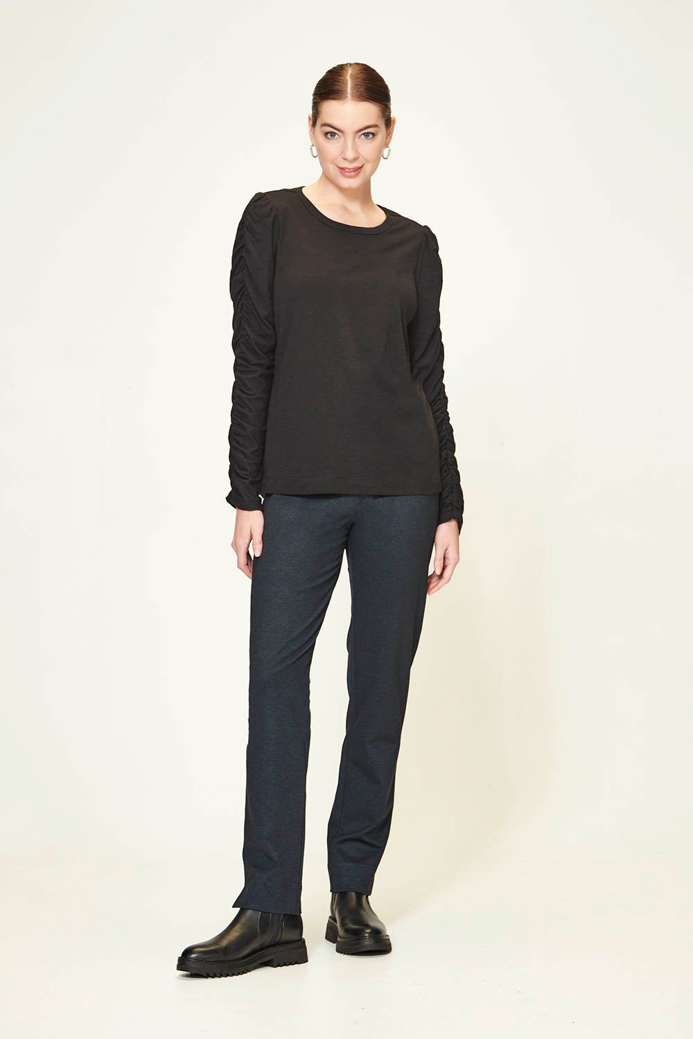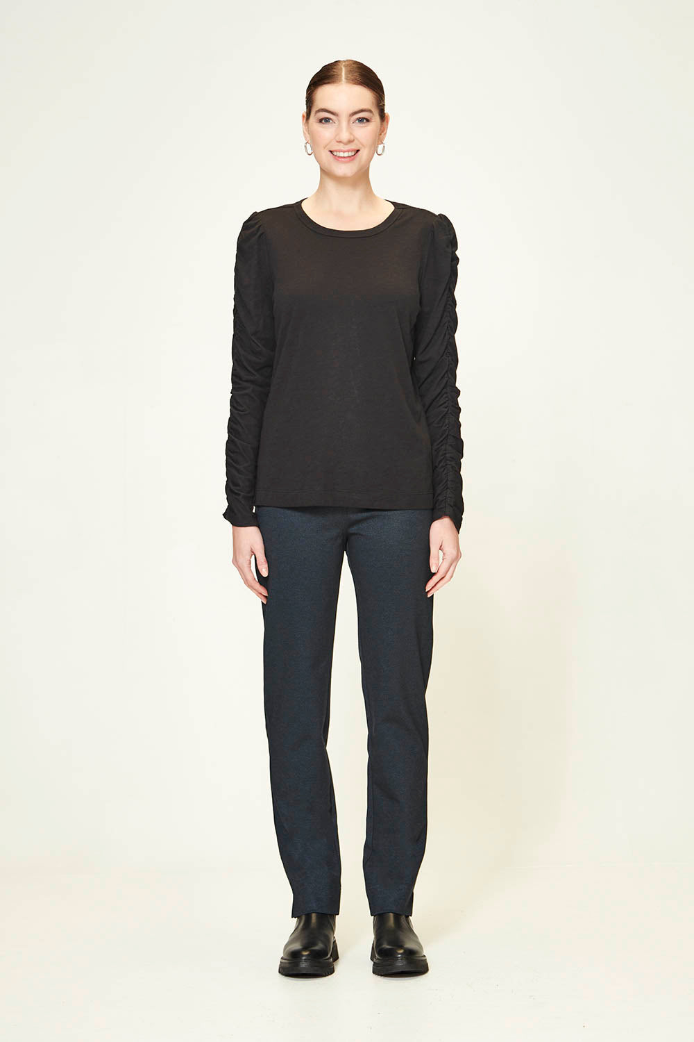 The ultimate winter pant in Black Check printed deluxe Ponti. Pull-on pants with slim legs and a Basque waist. Full-length.