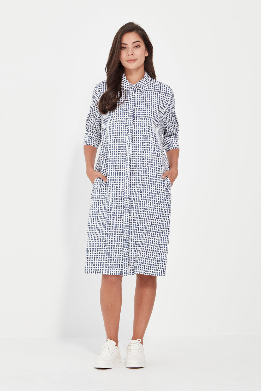 The Acrobat Tile Dress features a collared neckline and lantern sleeves that finish just above the elbow. Designed to button through the front, this easy-wear dress falls above the knee, offering a relaxed yet polished silhouette for everyday style. The elegant tile-inspired print in tonal shades of bark brings a fresh, modern edge