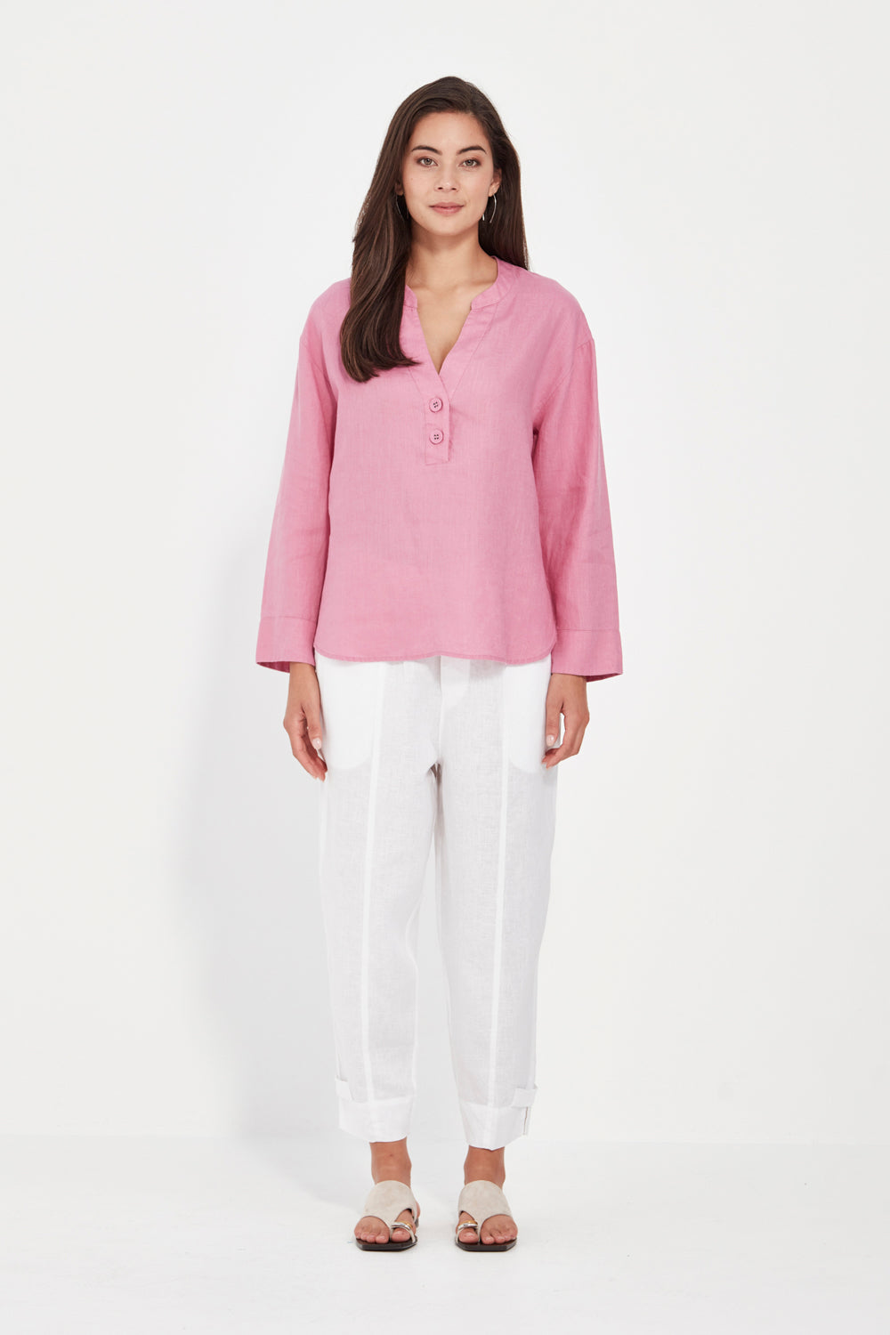 Cassie Top β 100% linen with V-neck collar, self-covered buttons, bracelet sleeves, and curved hem with side splits. Relaxed, polished, and timeless.