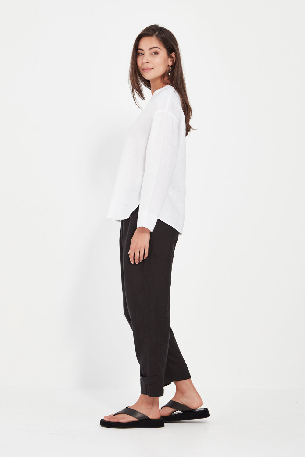 Crafted in 100% linen, the Cassie Top is effortlessly versatile—polished enough for dinner, relaxed enough for every day. Featuring a flattering V-neckline with a collar stand and self-covered buttons, it’s designed with a slightly dropped shoulder and bracelet-length sleeves, finished with a deep hem. Side splits and a curved hemline add ease and movement to this timeless silhouette.