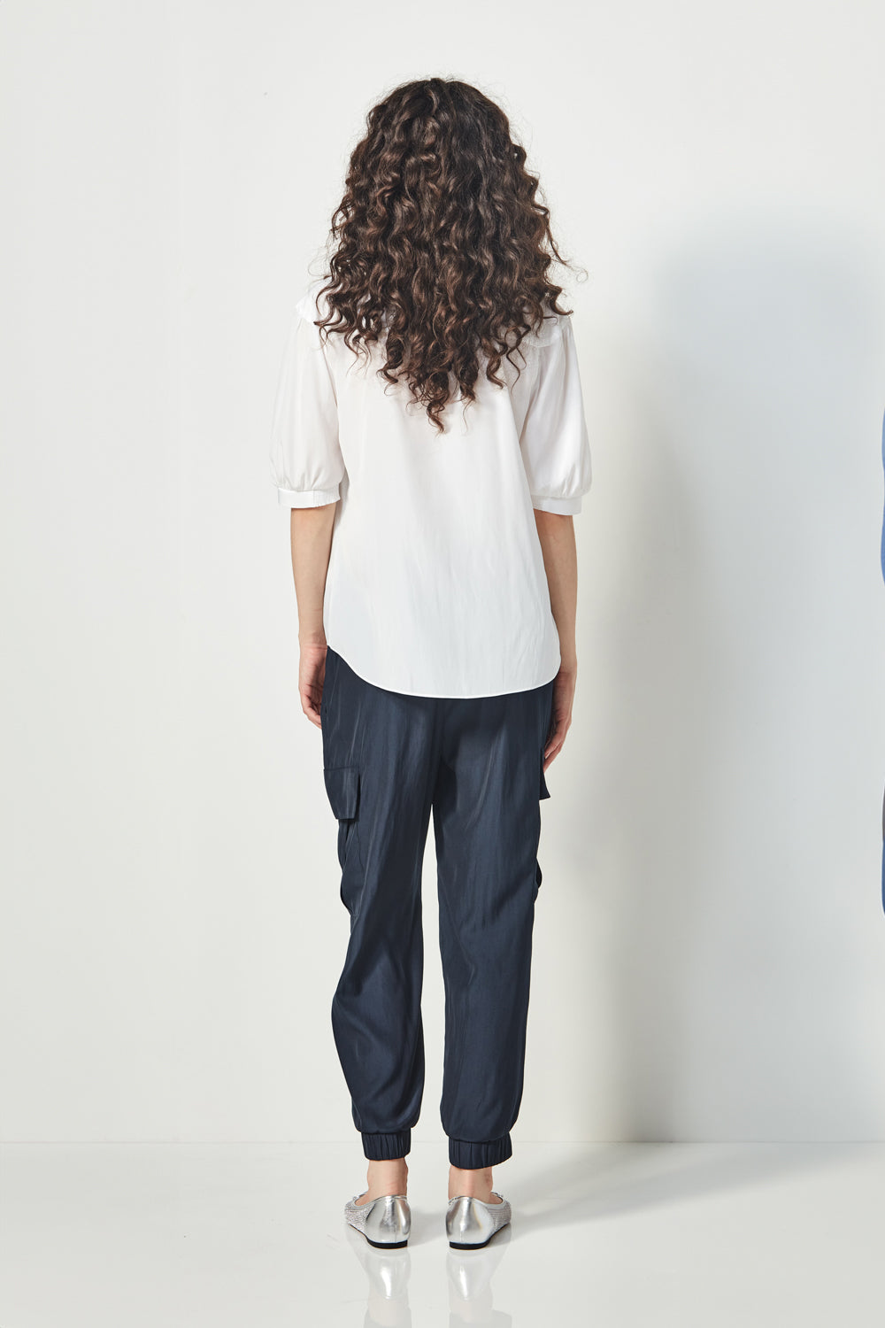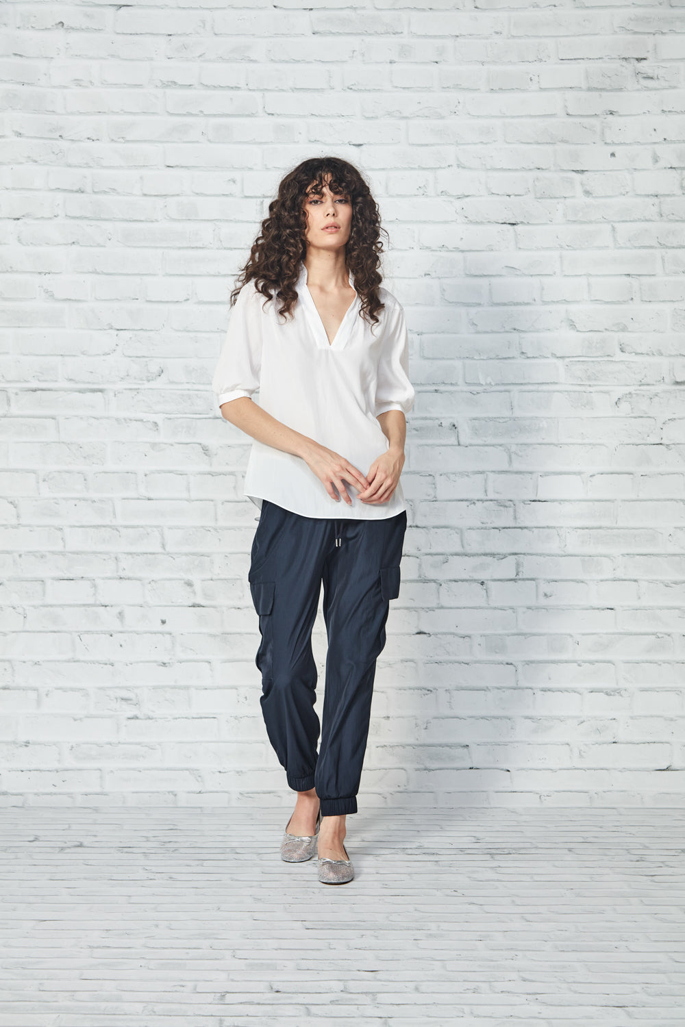 Printed soft tumbled satin top with Mandarin collar and V neckline.  The Clara top features an elbow-length sleeve gathered onto a half-shirred cuff.  With a curved hemline, the Clara top falls to the hip with a slightly longer back hemline.