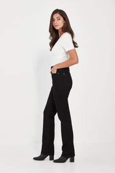 Electra Jean — super-stretch straight leg with high rise, fly front, and 5-pocket styling. Relaxed ankle and curve-friendly fit for all-day comfort.