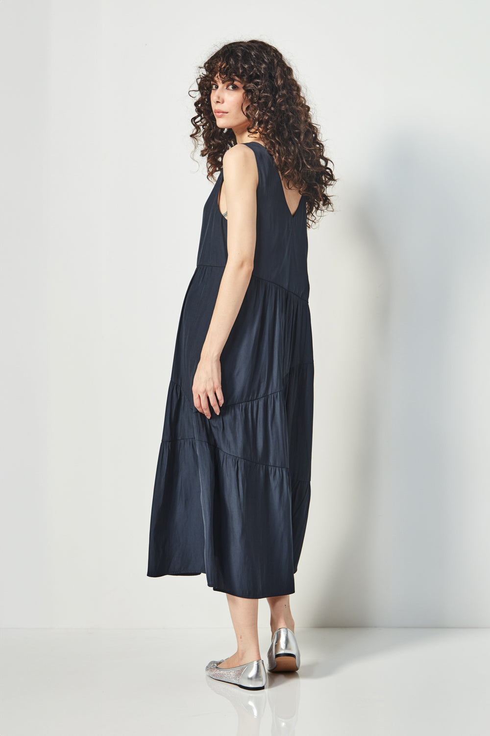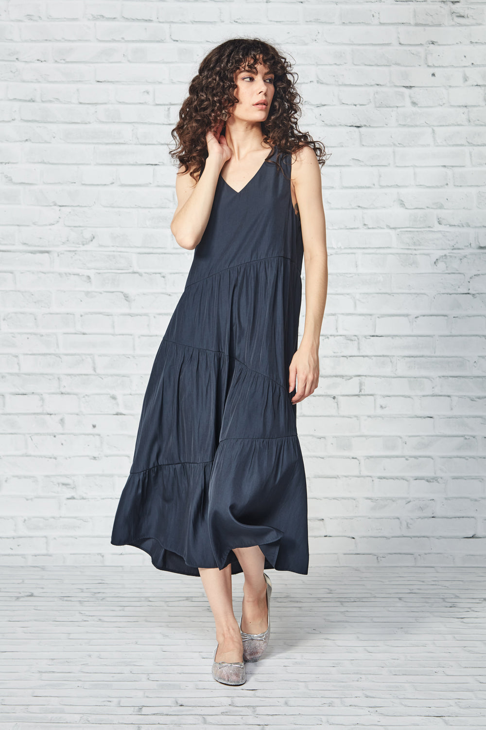 Soft tumbled satin sleeveless dress with V neckline on the front and back.  Angled softly gathered 3-tier skirt.  The Mackenzie dress falls to the lower calf.
