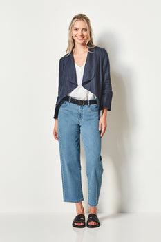 Proof Jacket — 100% linen with shawl collar, double peplum waist, and flared bracelet sleeve. Hip-length, refined and softly tailored.
