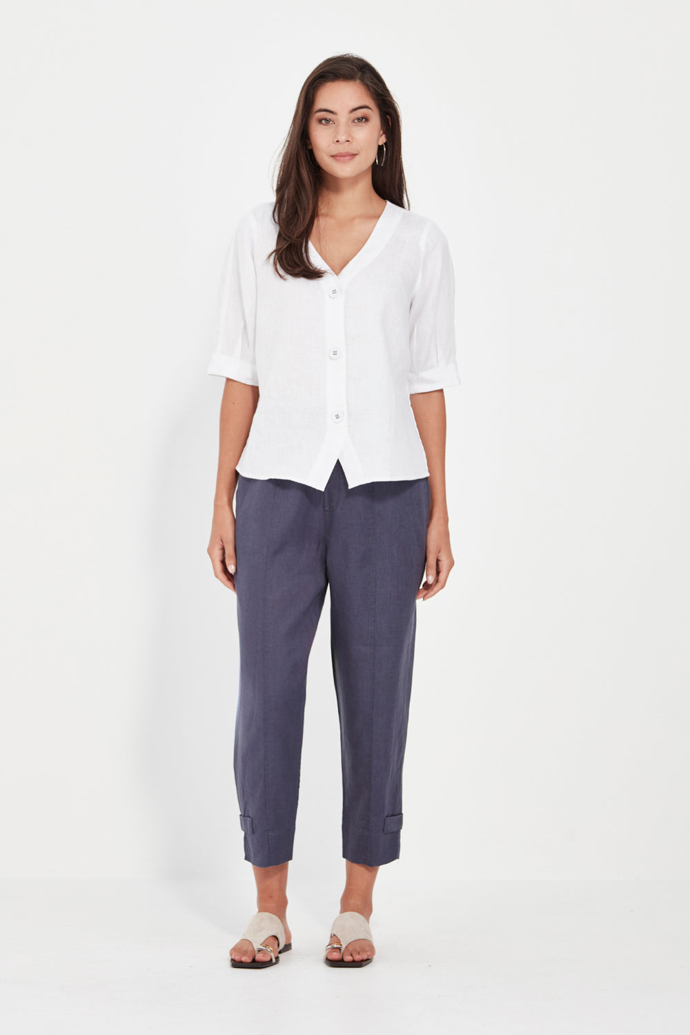 Crafted from 100% linen, the Elena Pant offers an easy, relaxed fit with a tapered leg that finishes at the ankle. An elasticated waistband ensures comfort, while panel detailing through the front and back adds subtle structure. Side pockets, back patch pockets, and a split hem accented with herringbone tape complete this effortlessly stylish silhouette.