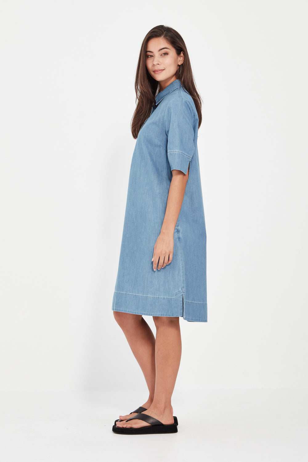 The Alex Dress is a relaxed yet refined shift silhouette crafted from soft-washed chambray denim. It features a stand collar, half-placket front, and elbow-length straight sleeves finished with split cuffs. An inverted pleat at the back adds ease of movement, while side pockets enhance functionality. Effortlessly stylish and endlessly wearable, it’s a timeless design that flatters all body shapes.