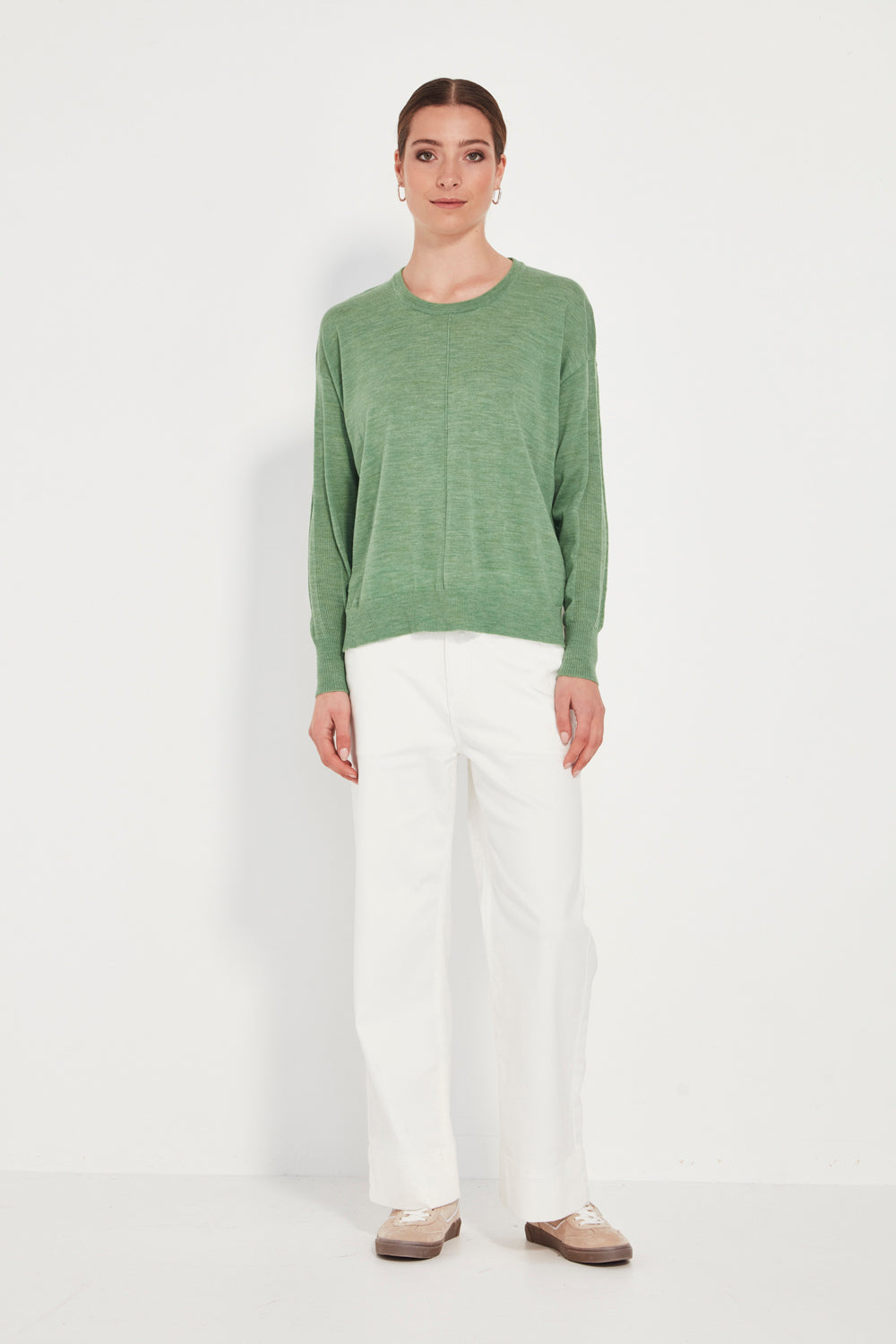 The Percy Sweater is crafted from 100% Merino, offering natural softness, lightweight warmth, and a beautifully refined drape. A clean crew neckline keeps the silhouette timeless, while the front seam detail adds subtle structure through the body.