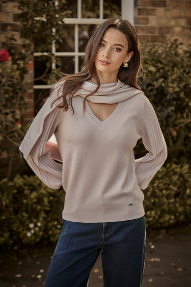 The Nina Sweater is crafted from 100% Merino, offering natural softness, warmth, and a beautifully smooth drape. A refined V-neckline frames the face, while the pleated bell-shaped sleeves create a striking, feminine silhouette. The dramatic shape is anchored by a deep rib cuff, giving the sleeve its distinctive sculptural volume.