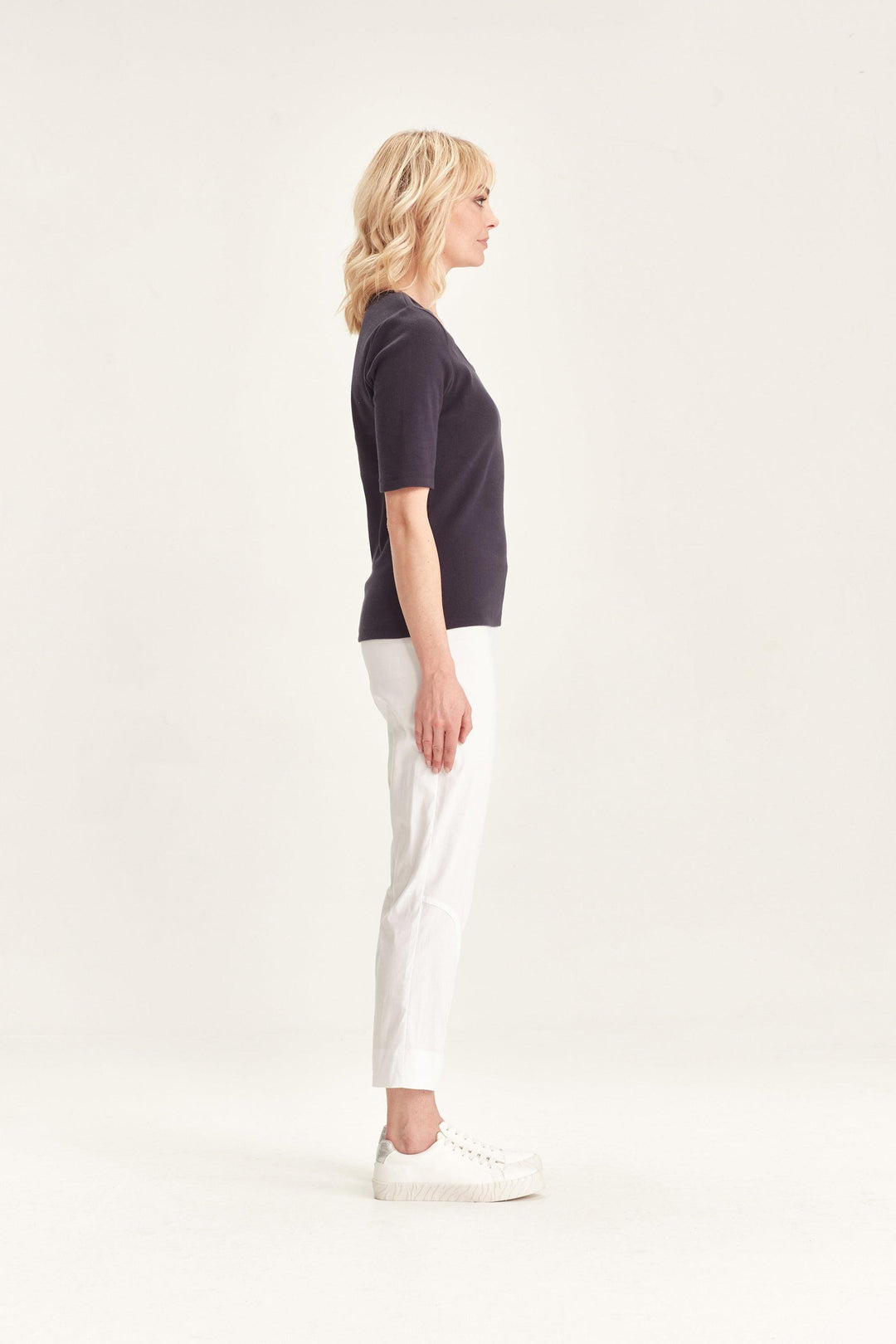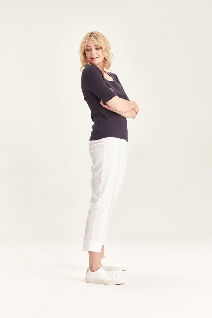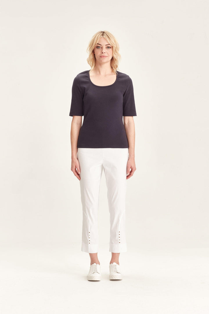 Verge's 'Acrobat' styles are all-time favorites for their fit, comfort, breathability, and easy care. The stretch Eyelet 7/8 pant has fun eyelet detail below the knee and a concealed elasticized waistband in a lightweight European fabric.