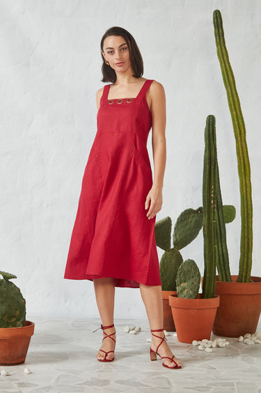 Crafted in 100% Linen sundress with feature eyelet detail on the front and wide shoulder straps. The Vivan dress is waisted and has angled front pockets. The Vivan dress falls to mid-calf.