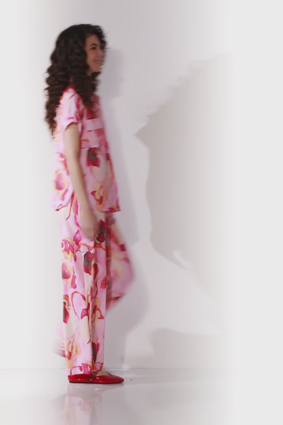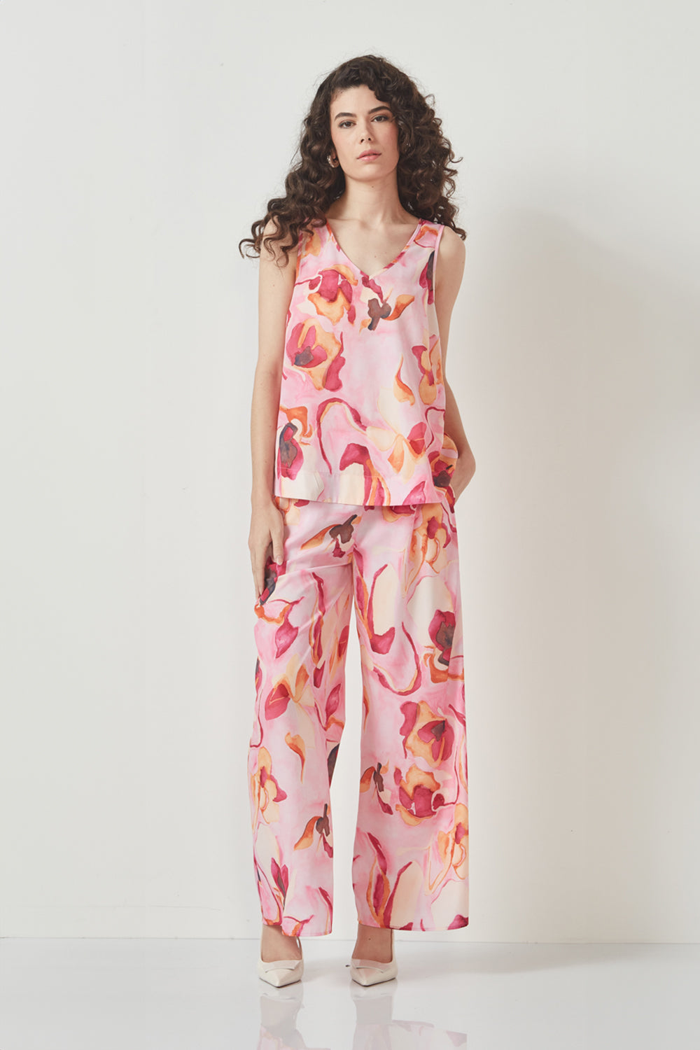 Crafted with a soft tumbled satin fabric, these full-length pants feature a wide-leg design and convenient side pockets.