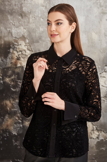 The Glide Allegra shirt is made of textured lace fabric with a contrast collar, button placket, and cuff. It buttons through the front. The slim bracelet-length sleeve features a deep cuff fastened with cuff links. The cuff can be worn turned back. Cuffs have cufflink fastening. Separate cami included.