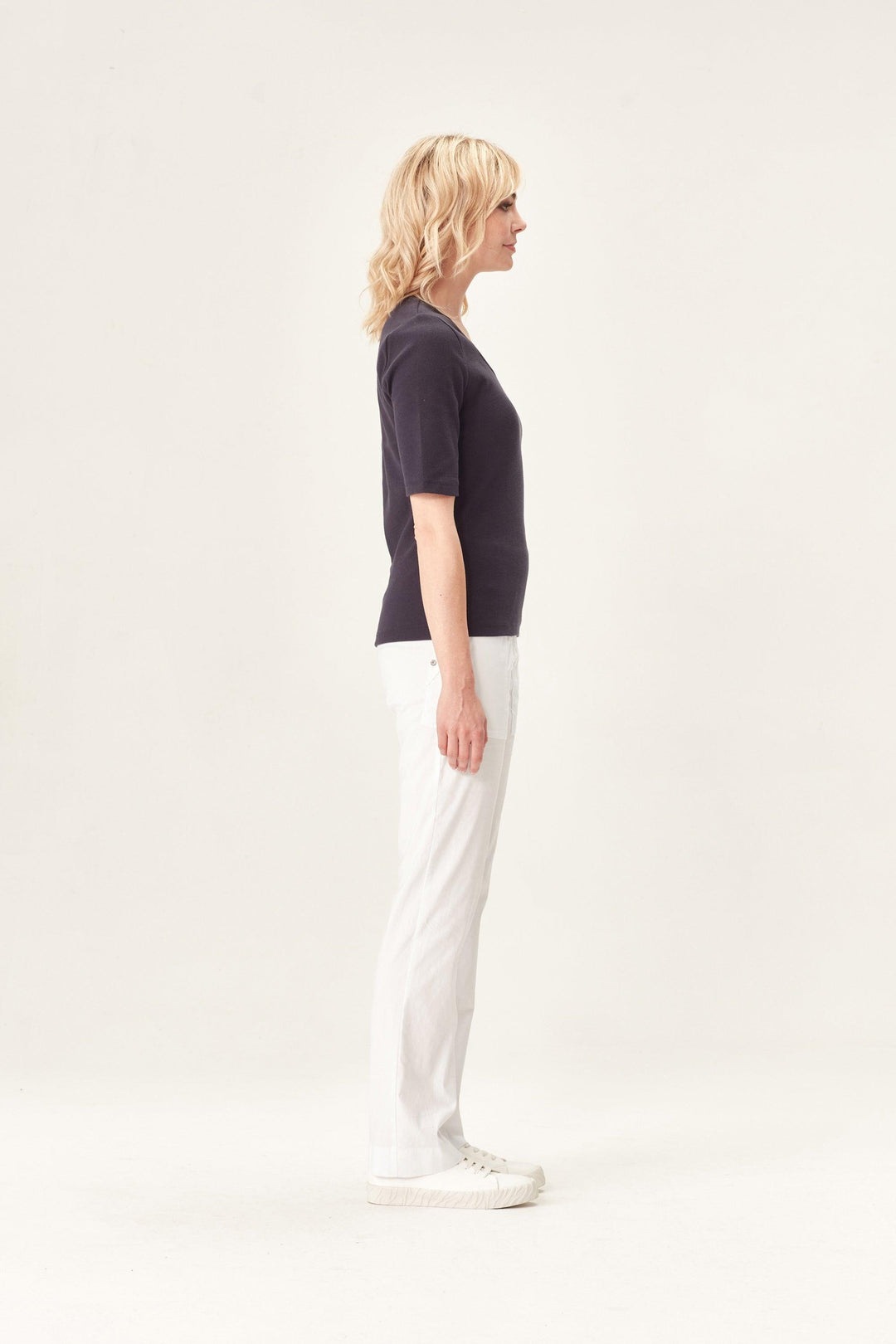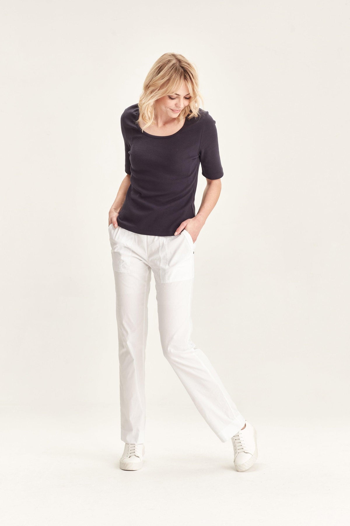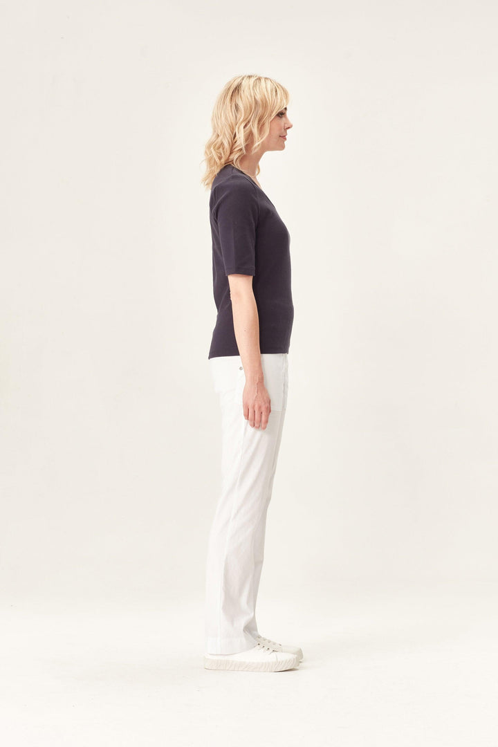 A classic full-length pant. Easy fitting straight leg. Neat interest front pockets. Subtle rivet detail. Easy-fitting pants made in VERGE's exclusive European lightweight stretch Cotton Acrobat fabric for comfort, breathability, and easy care.