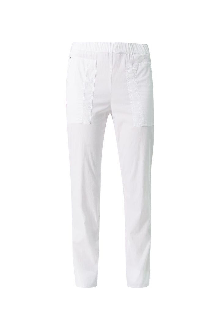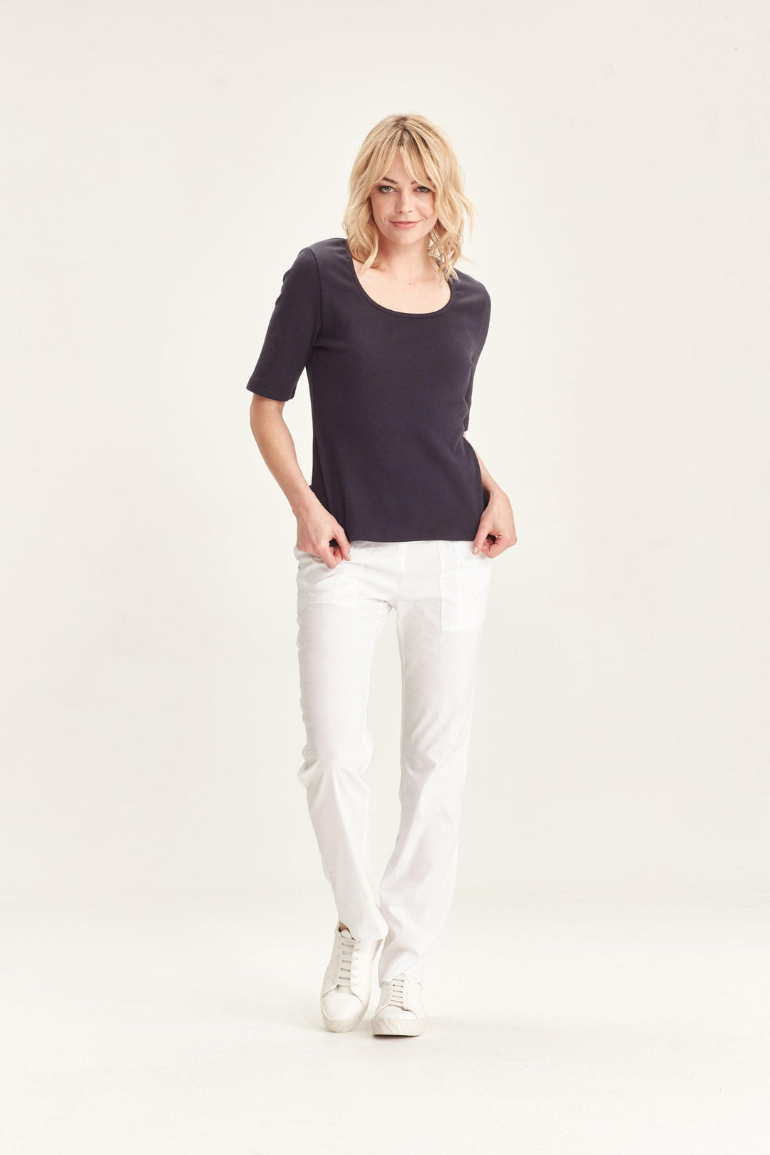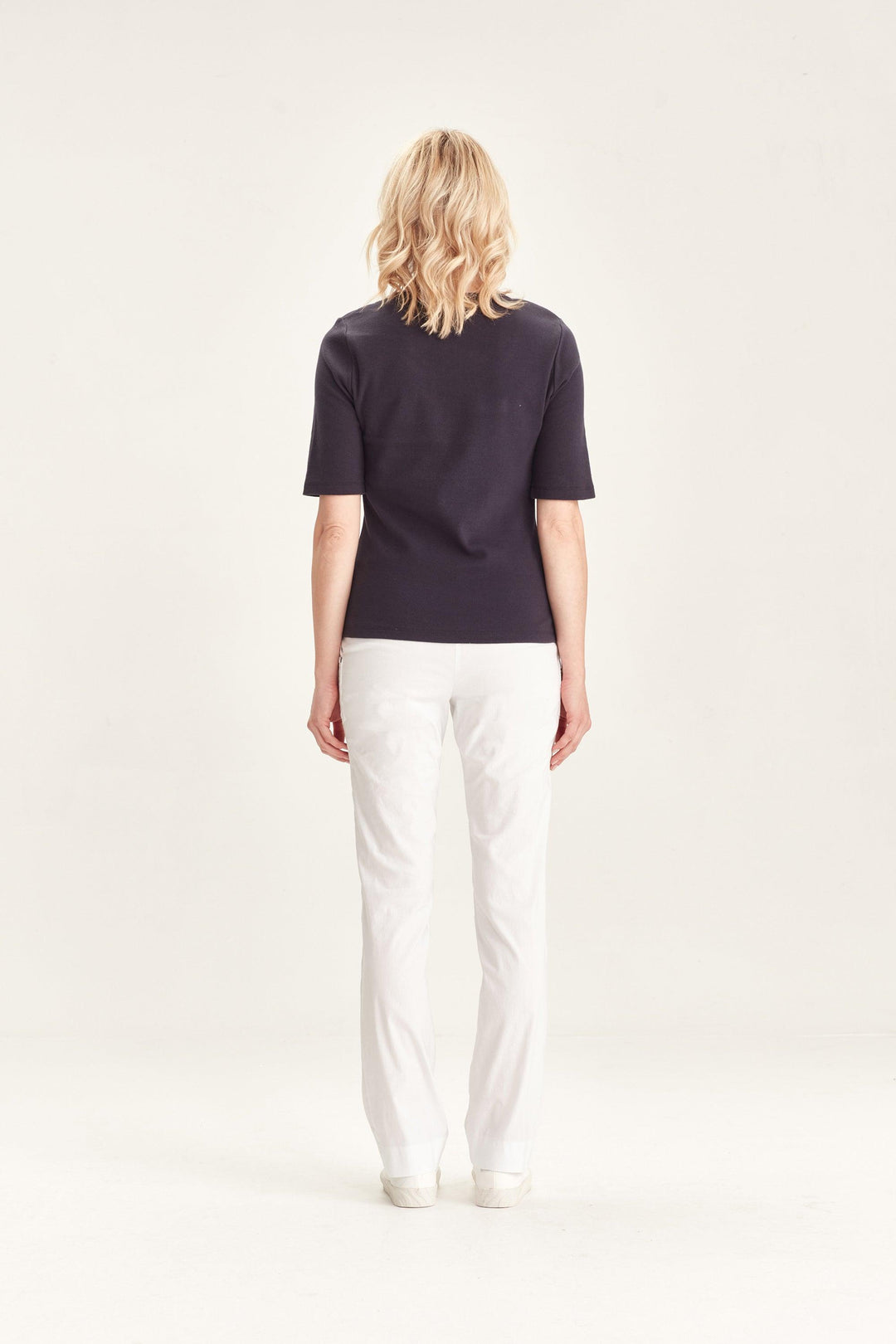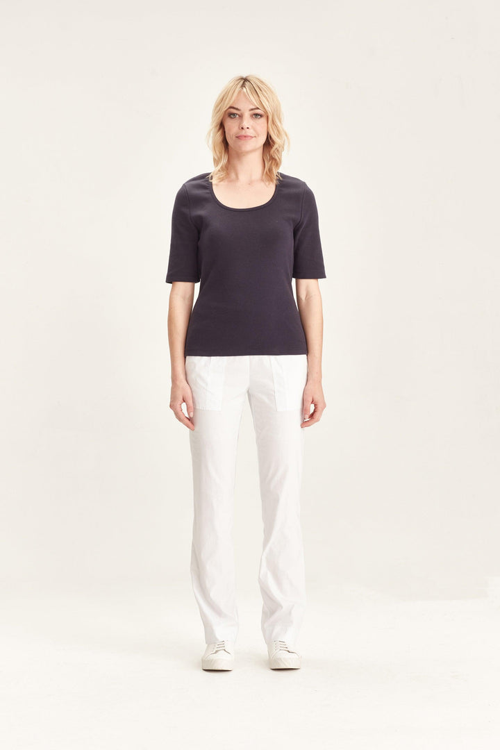 A classic full-length pant. Easy fitting straight leg. Neat interest front pockets. Subtle rivet detail. Easy-fitting pants made in VERGE's exclusive European lightweight stretch Cotton Acrobat fabric for comfort, breathability, and easy care.